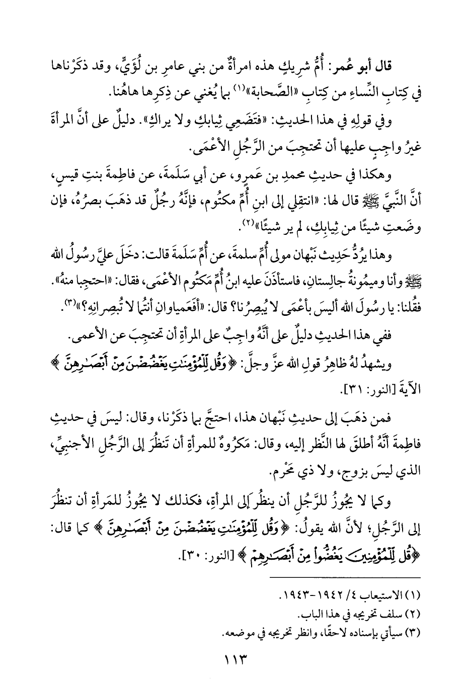 وكما لا يجُوزُ للرَّجُلِ أن ينظُرَ إلى المرأةِ، فكذلك لا يجُوزُ للمَرأةِ أن تنظُرَ إلى الرَّجُلِ؛ لأنَّ الله يقولُ: {وَقُلْ لِلْمُؤْمِنَاتِ يَغْضُضْنَ مِنْ أَبْصَارِهِنَّ} كما قال: {قُلْ لِلْمُؤْمِنِينَ يَغُضُّوا مِنْ أَبْصَارِهِمْ} [النور: ٣٠].