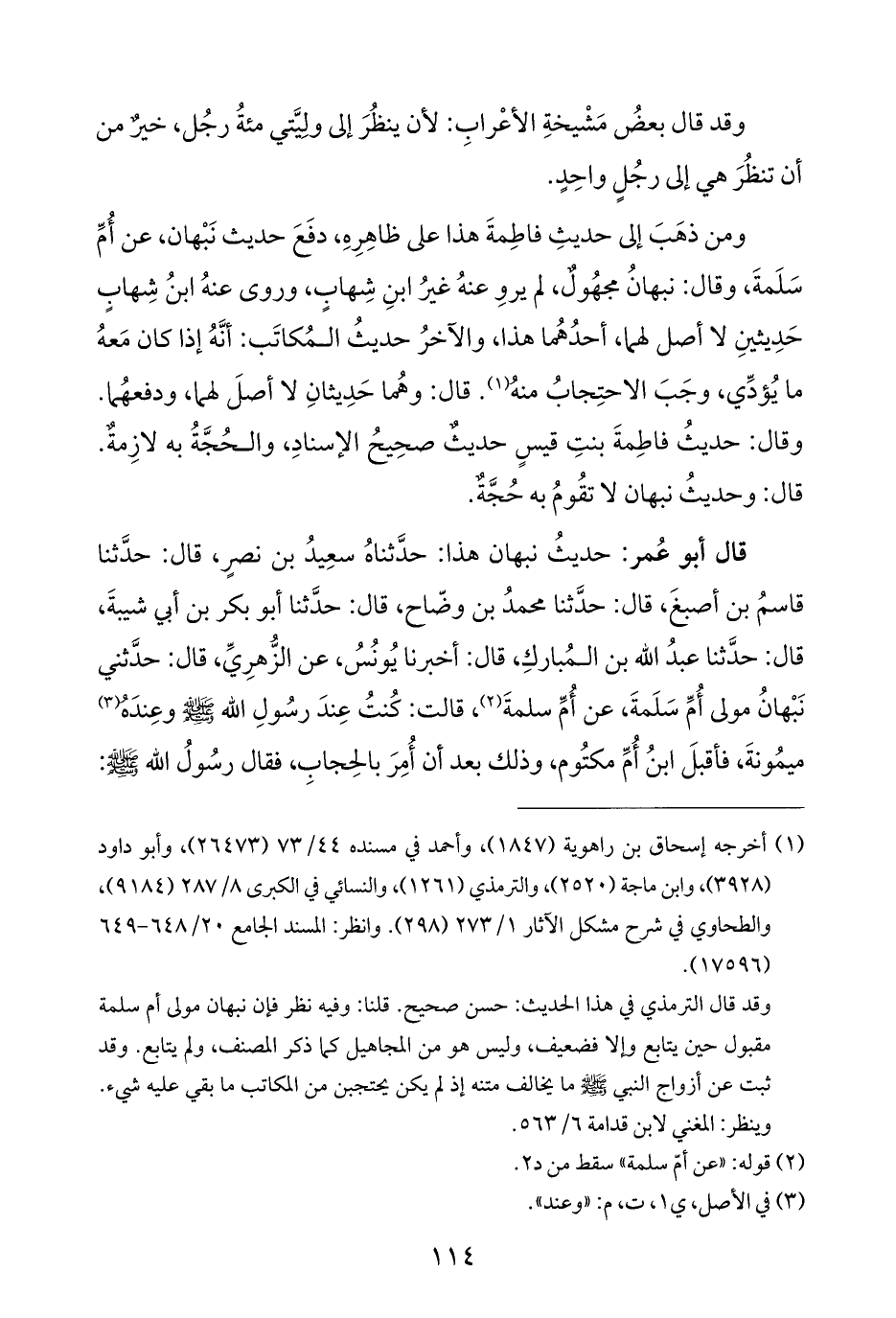 ومن ذهَبَ إلى حديثِ فاطِمةَ هذا على ظاهِرِهِ، دفَعَ حديث نَبْهان، عن أُمِّ سَلَمةَ، وقال: نبهانُ مجهُولٌ، لم يروِ عنهُ غيرُ ابنِ شِهابٍ، وروى عنهُ ابنُ شِهابٍ حَدِيثينِ لا أصل لهما، أحدُهُما هذا، والآخرُ حديثُ المُكاتَب: أنَّهُ إذا كان مَعهُ ما يُؤدِّي، وجَبَ الاحتِجابُ منهُ (¬١). قال: وهُما حَدِيثانِ لا أصلَ لهما، ودفعهُما. وقال: حديثُ فاطِمةَ بنتِ قيسٍ حديثٌ صحِيحُ الإسنادِ، والحُجَّةُ به لازِمة. قال: وحديثُ نبهان لا تقُومُ به حُجَّةٌ.