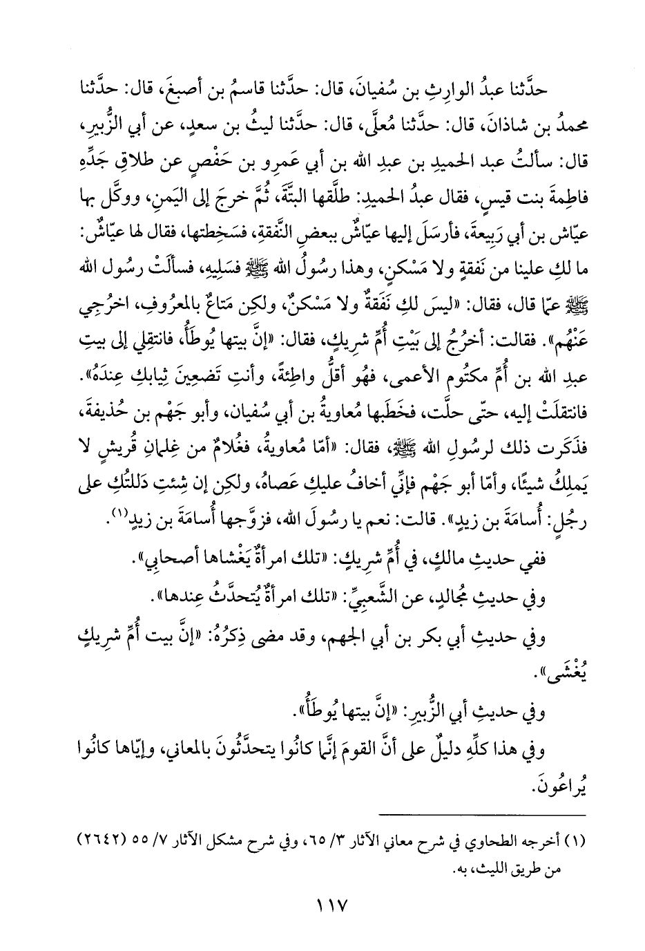 حدَّثنا عبدُ الوارِثِ بن سُفيانَ، قال: حدَّثنا قاسمُ بن أصبغَ، قال: حدَّثنا محمدُ بن شاذانَ، قال: حدَّثنا مُعلَّى، قال: حدَّثنا ليثُ بن سعدٍ، عن أبي الزُّبيرِ، قال: سألتُ عبد الحميدِ بن عبدِ الله بن أبي عَمرِو بن حَفْصٍ عن طلاقِ جَدِّهِ فاطِمةَ بنت قيسٍ، فقال عبدُ الحميدِ: طلَّقها البتّة، ثُمَّ خرجَ إلى اليَمنِ، ووكَّل بها عيّاش بن أبي رَبِيعةَ، فأرسَلَ إليها عيّاشٌ ببعضِ النَّفقةِ، فسَخِطتها، فقال لها عيّاش: ما لكِ علينا من نَفقةٍ ولا مَسْكنٍ، وهذا رسُولُ الله - صلى الله عليه وسلم - فسَلِيهِ، فسألَتْ رسُول الله - صلى الله عليه وسلم - عمّا قال، فقال: "ليسَ لكِ نَفَقةٌ ولا مَسْكنٌ، ولكِن مَتاعٌ بالمعرُوفِ، اخرُجِي عَنْهُم". فقالت: أخرُجُ إلى بَيْتِ أُمِّ شرِيكٍ، فقال: "إنَّ بيتها يُوطَأُ، فانتقِلي إلى بيتِ عبدِ الله بن أُمِّ مكتُوم الأعمى، فهُو أقلُّ واطِئةً، وأنتِ تَضعِينَ ثِيابكِ عِندَهُ". فانتقلَتْ إليه، حتَّى حلَّت، فخَطَبها مُعاويةُ بن أبي سُفيان، وأبو جَهْم بن حُذيفةَ، فذَكَرت ذلك لرسُولِ الله - صلى الله عليه وسلم -، فقال: "أمّا مُعاويةُ، فغُلامٌ من غِلمانِ قُريشٍ لا يَملِكُ شيئًا، وأمّا أبو جَهْم فإنِّي أخافُ عليكِ عَصاهُ، ولكِن إن شِئتِ دَللتُكِ على رجُلٍ: أُسامَةَ بن زيدٍ". قالت: نعم يا رسُولَ الله، فزوَّجها أُسامَةَ بن زيدٍ (¬١).
