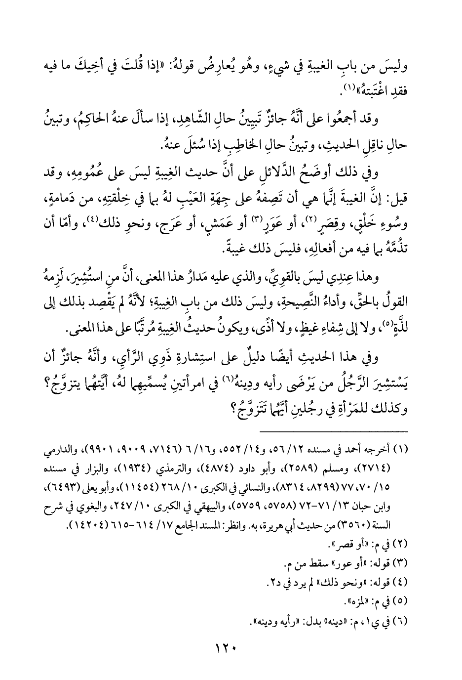 وليسَ من بابِ الغيبةِ في شيءٍ، وهُو يُعارِضُ قولهُ: "إذا قُلتَ في أخِيكَ ما فيه فقدِ اغْتَبتهُ" (¬١).
