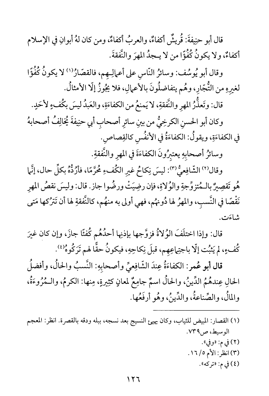 قال أبو حنِيفةَ: قُريشٌ أكفاءٌ، والعربُ أكفاءٌ، ومن كان لهُ أبوانِ في الإسلام أكفاءٌ، ولا يكونُ كُفُؤًا من لا يجدُ المهرَ والنَّفقةَ.