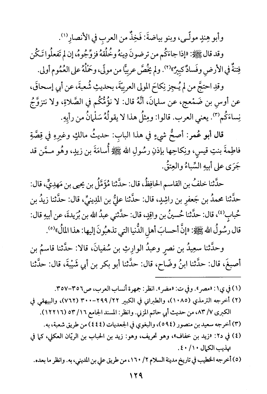قال أبو عُمر: أصحُّ شيءٍ في هذا البابِ: حديثُ مالكٍ وغيرِهِ في قِصَّةِ فاطِمةَ بنتِ قيسٍ، ونِكاحِها بإذنِ رسُولِ الله - صلى الله عليه وسلم - أُسامَةَ بن زيدٍ، وهُو ممَّن قد جَرَى على أبيهِ السِّباءُ والعِتقُ.