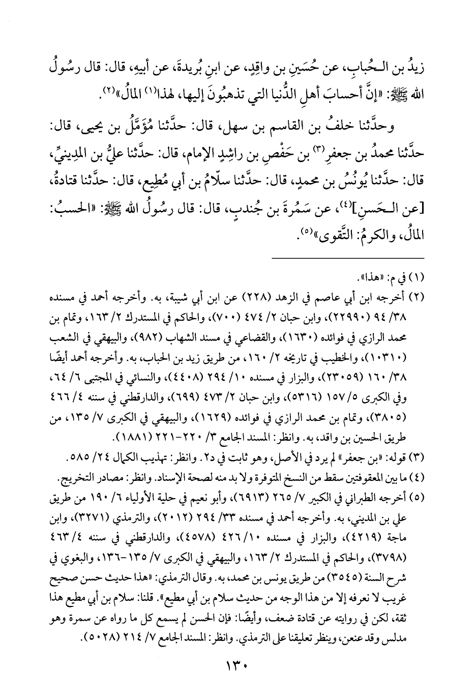 زيدُ بن الحُبابِ، عن حُسَينِ بن واقِدٍ، عن ابنِ بُريدةَ، عن أبيهِ، قال: قال رسُولُ الله - صلى الله عليه وسلم -: "إنَّ أحسابَ أهلِ الدُّنيا التي تذهبُونَ إليها، لهذا (¬١) المالُ" (¬٢).