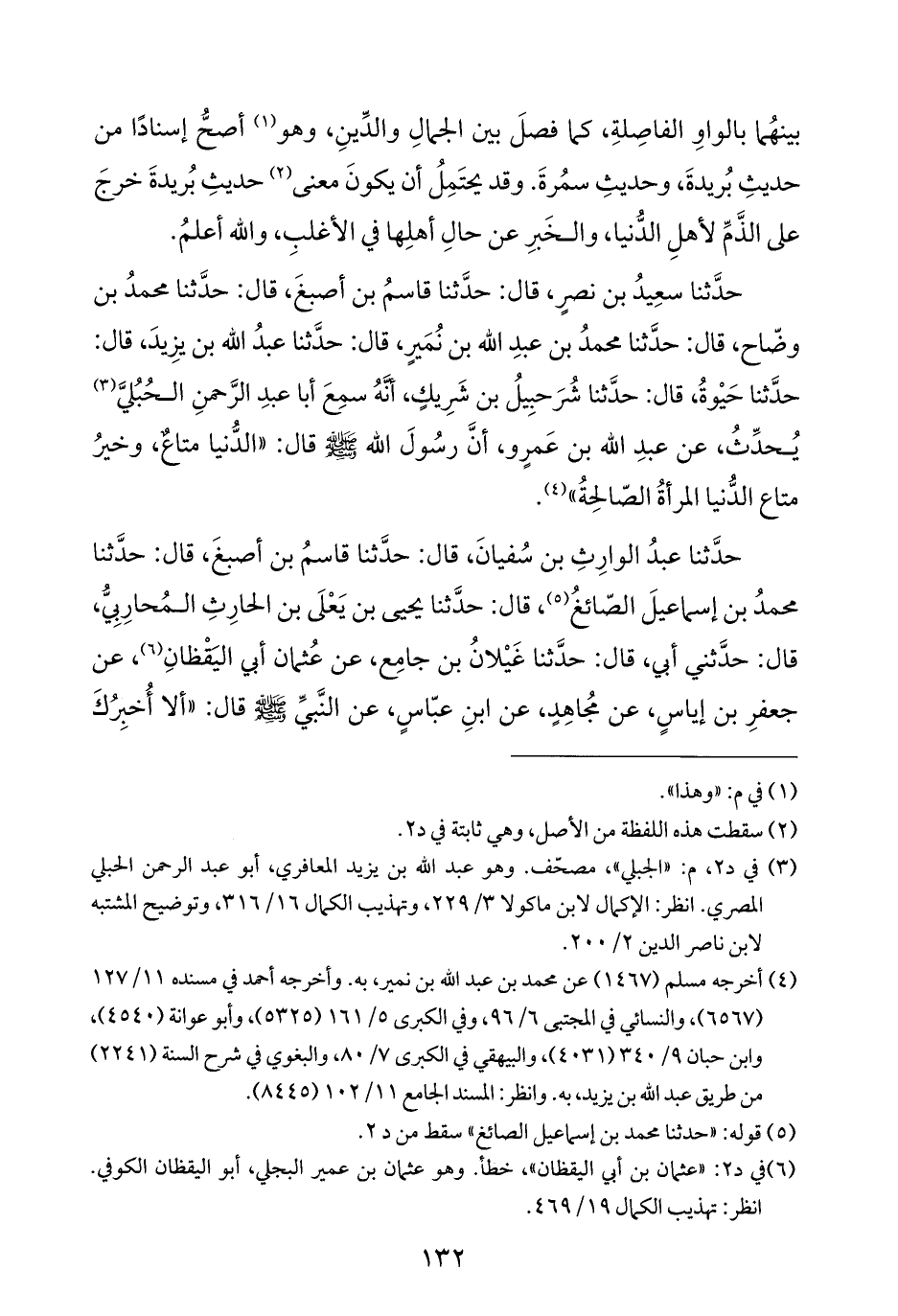 حدَّثنا سعِيدُ بن نصرٍ، قال: حدَّثنا قاسمُ بن أصبغَ، قال: حدَّثنا محمدُ بن وضّاح، قال: حدَّثنا محمدُ بن عبدِ الله بن نُمَيرٍ، قال: حدَّثنا عبدُ الله بن يزِيدَ، قال: حدَّثنا حَيْوةُ، قال: حدَّثنا شُرَحبِيلُ بن شَرِيكٍ، أَنَّهُ سمِعَ أبا عبدِ الرَّحمنِ الحُبُليَّ (¬٣) يُحدِّثُ، عن عبدِ الله بن عَمرٍو، أنَّ رسُولَ الله - صلى الله عليه وسلم - قال: "الدُّنيا متاعٌ، وخيرُ متاع الدُّنيا المرأةُ الصّالحِةُ" (¬٤).