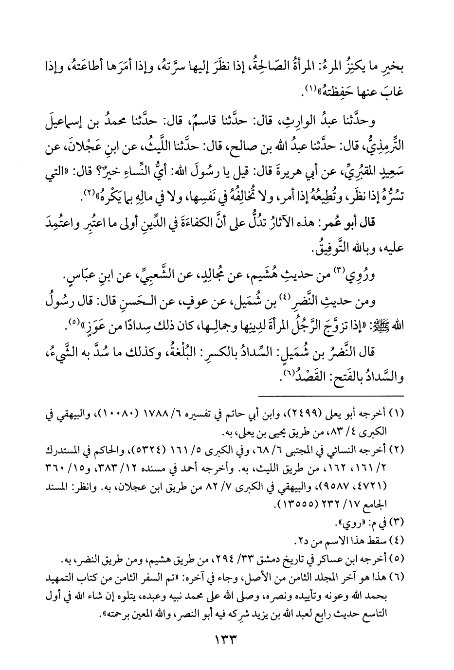 وحدَّثنا عبدُ الوارِثِ، قال: حدَّثنا قاسمٌ، قال: حدَّثنا محمدُ بن إسماعيلَ التِّرمذِيُّ، قال: حدَّثنا عبدُ الله بن صالح، قال: حدَّثنا اللَّيثُ، عن ابنِ عَجْلانَ، عن سَعِيدٍ المقبُرِيِّ، عن أبي هريرةَ قال: قيل يا رسُولَ الله: أيُّ النِّساءِ خيرٌ؟ قال: "التي تسُرُّهُ إذا نظَر، وتُطِيعُهُ إذا أمر، ولا تُخَالِفُهُ في نَفسِها، ولا في مالِهِ بما يَكْرهُ" (¬٢).