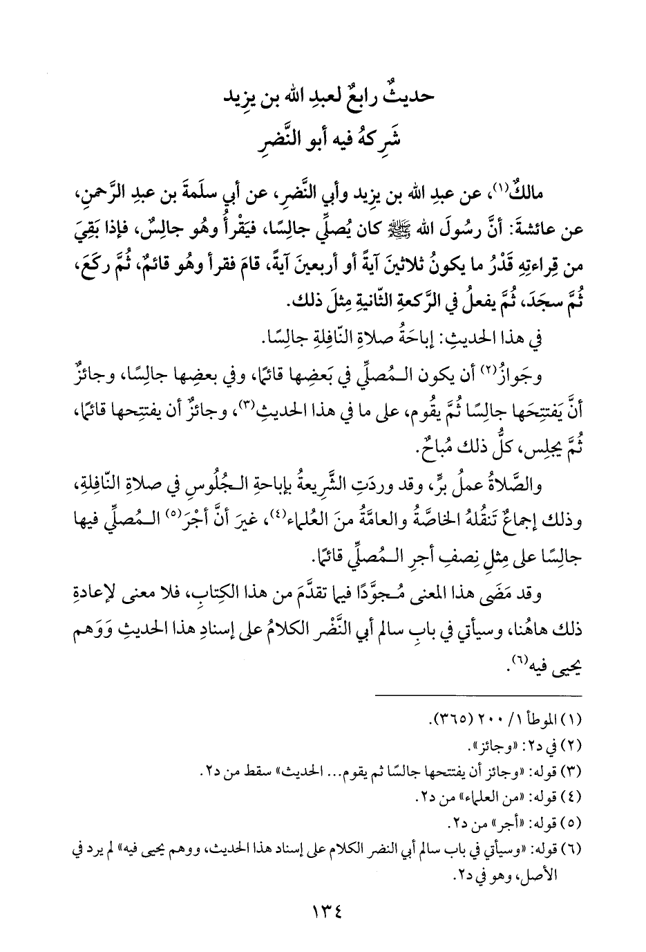 مالكٌ (¬١)، عن عبدِ الله بن يزِيد وأبي النَّضرِ، عن أبي سلَمةَ بن عبدِ الرَّحمنِ، عن عائشةَ: أنَّ رسُولَ الله - صلى الله عليه وسلم - كان يُصلِّي جالِسًا، فيَقْرأُ وهُو جالِسٌ، فإذا بَقِيَ من قِراءتِهِ قَدْرُ ما يكونُ ثلاثينَ آيةً أو أربعينَ آيةً، قامَ فقرأ وهُو قائمٌ، ثُمَّ ركَعَ، ثُمَّ سجَدَ، ثُمَّ يفعلُ في الرَّكعةِ الثّانيةِ مِثلَ ذلك.