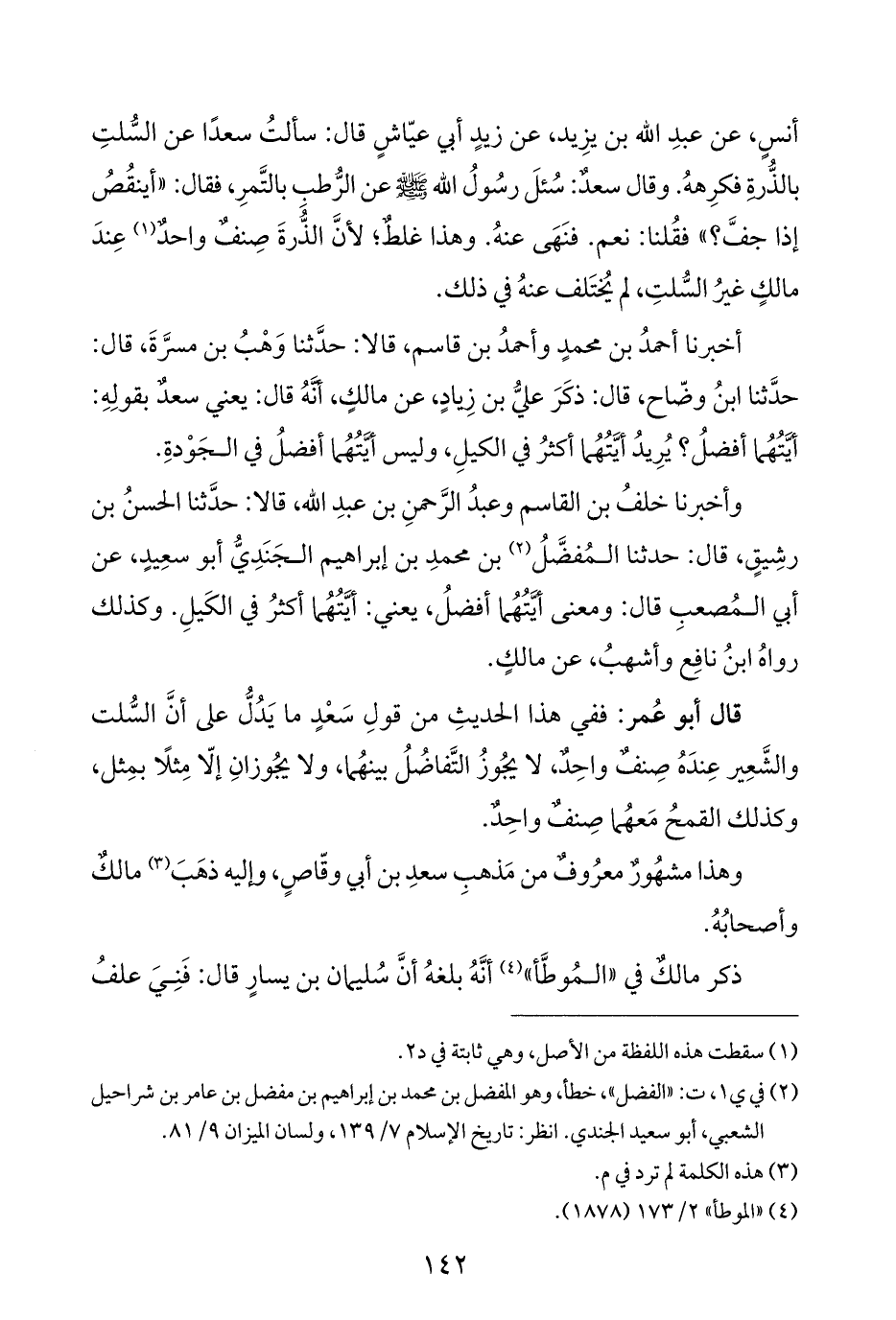 أخبرنا أحمدُ بن محمدٍ وأحمدُ بن قاسم، قالا: حدَّثنا وَهْبُ بن مسرَّةَ، قال: حدَّثنا ابنُ وضّاح، قال: ذكَرَ عليُّ بن زِيادٍ، عن مالكٍ، أنَّهُ قال: يعني سعدٌ بقولِهِ: أيَّتُهُما أفضلُ؟ يُرِيدُ أيَّتُهُما أكثرُ في الكيلِ، وليس أيَّتُهُما أفضلُ في الجَوْدةِ.