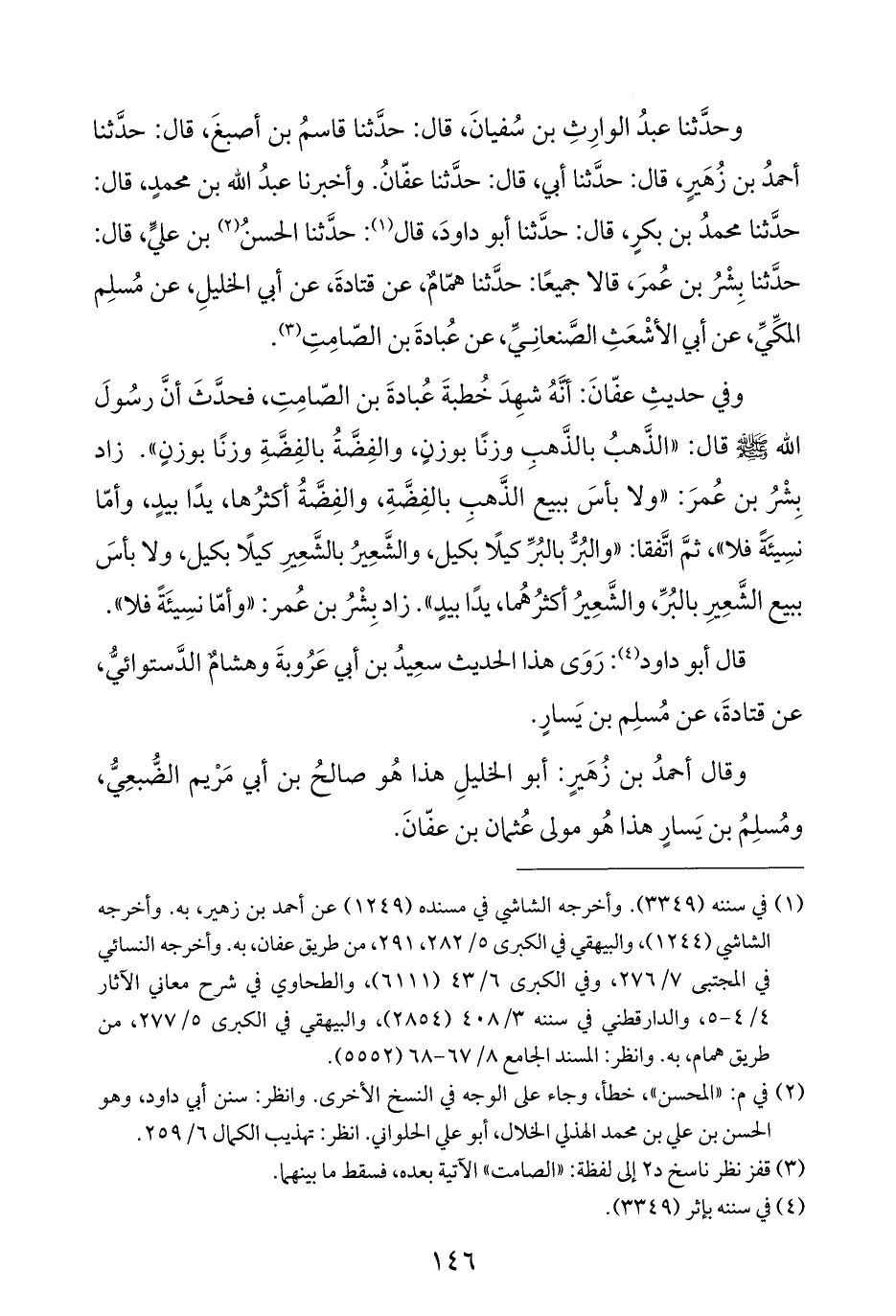 وحدَّثنا عبدُ الوارِثِ بن سُفيانَ، قال: حدَّثنا قاسمُ بن أصبغَ، قال: حدَّثنا أحمدُ بن زُهَيرٍ، قال: حدَّثنا أبي، قال: حدَّثنا عفّانُ. وأخبرنا عبدُ الله بن محمدٍ، قال: حدَّثنا محمدُ بن بكرٍ، قال: حدَّثنا أبو داودَ، قال (¬١): حدَّثنا الحسنُ (¬٢) بن عليٍّ، قال: حدَّثنا بِشْرُ بن عُمرَ، قالا جميعًا: حدَّثنا همّام، عن قتادةَ، عن أبي الخليلِ، عن مُسلِم المكِّيِّ، عن أبي الأشْعَثِ الصَّنعانِيِّ، عن عُبادةَ بن الصّامِتِ (¬٣).