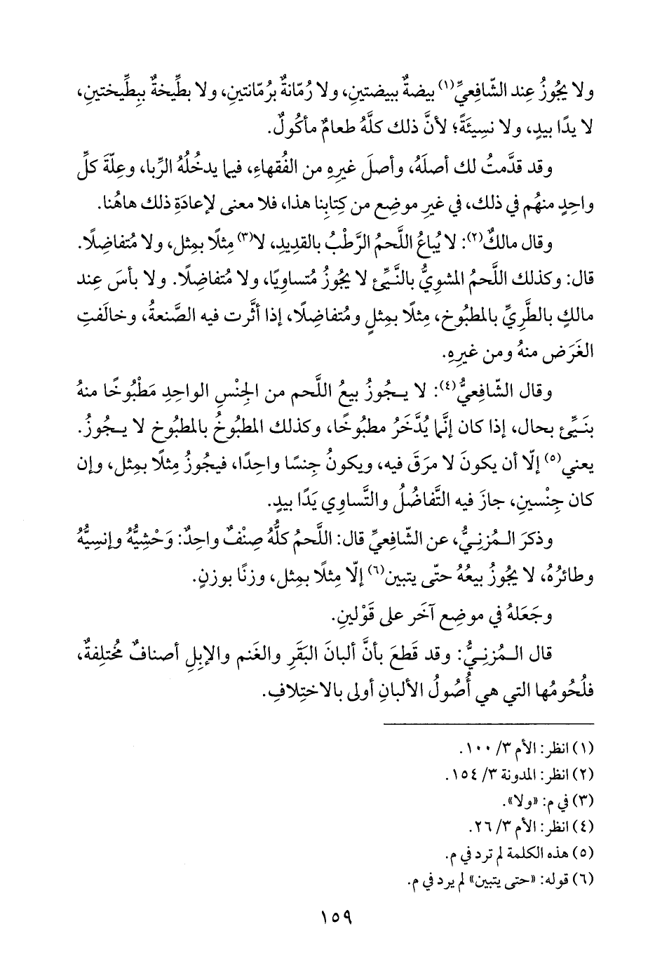 وقال الشّافِعيُّ (¬٤): لا يجُوزُ بيعُ اللَّحم من الجِنْسِ الواحِدِ مَطْبُوخًا منهُ بنَيِّئ بحال، إذا كان إنَّما يُدَّخَرُ مطبُوخًا، وكذلك المطبُوخُ بالمطبُوخ لا يجُوزُ. يعني (¬٥) إلّا أن يكونَ لا مرَقَ فيه، ويكونُ جِنسًا واحِدًا، فيجُوزُ مِثلًا بمِثل، وإن كان جِنْسينِ، جازَ فيه التَّفاضُلُ والتَّساوِي يَدًا بيدٍ.