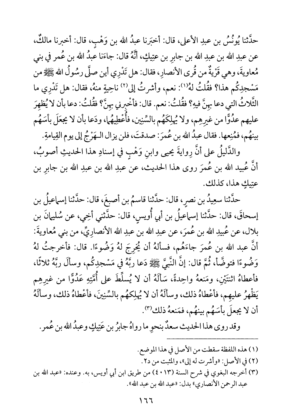 حدَّثنا يُونُسُ بن عبدِ الأعلى، قال: أخبَرنا عبدُ الله بن وَهْبٍ، قال: أخبرنا مالكٌ، عن عبدِ الله بن عبدِ الله بن جابرِ بن عتِيكٍ، أنَّهُ قال: جاءَنا عبدُ الله بن عُمر في بني مُعاويةَ، وهي قَرْيةٌ من قُرى الأنصارِ، فقال: هل تَدْرِي أين صلَّى رسُولُ الله - صلى الله عليه وسلم - من مَسْجدِكُم هذا؟ فقُلتُ لهُ (¬١): نعم، وأشرتُ إلى (¬٢) ناحِيةٍ منهُ، فقال: هل تَدْرِي ما الثَّلاثُ التي دعا بهِنَّ فيهِ؟ فقُلتُ: نعم. قال: فأخْبِرني بهِنَّ؟ فقُلتُ: دعا بأن لا يُظهِرَ عليهم عدُوًّا من غيرِهِم، ولا يُهلِكَهُم بالسِّنِين، فأُعْطِيهُما، ودَعا بأن لا يجعَلَ بأسَهُم بينهُم، فمُنِعها. فقال عبدُ الله بن عُمرَ: صدقتَ، فلن يزال الهَرْجُ إلى يوم القِيامةِ.