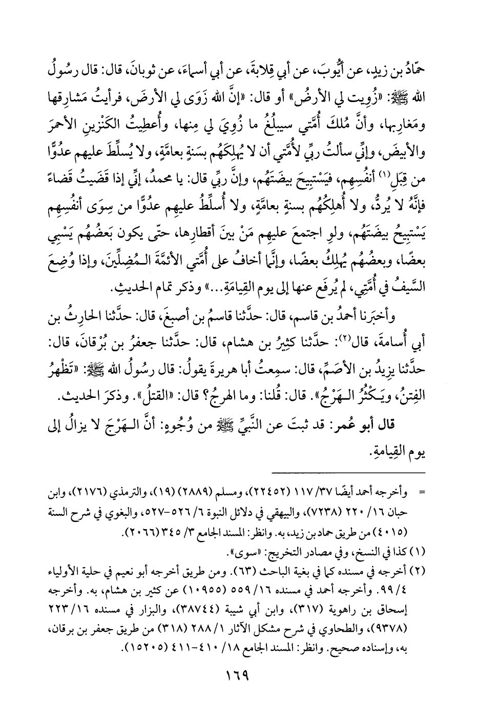 حمّادُ بن زيدٍ، عن أيُّوبَ، عن أبي قِلابةَ، عن أبي أسماءَ، عن ثوبانَ، قال: قال رسُولُ الله - صلى الله عليه وسلم - "زُوِيت لي الأرضُ" أو قال: "إنَّ الله زَوَى لي الأرضَ، فرأيتُ مَشارِقها ومَغارِبها، وأنَّ مُلكَ أُمَّتي سيبلُغُ ما زُوِيَ لي مِنها، وأُعطِيتُ الكَنْزينِ الأحمرَ والأبيضَ، وإنِّي سألتُ ربِّي لأُمَّتي أن لا يُهلِكَهُم بسَنةٍ بعامَّةٍ، ولا يُسلِّطَ عليهم عدُوًّا من قِبَلِ (¬١) أنفُسِهِم، فيَسْتبِيحَ بيضَتَهُم، وإنَّ ربِّي قال: يا محمدُ، إنِّي إذا قَضَيتُ قَضاءً فإنَّهُ لا يُردُّ، ولا أُهلِكُهُم بسنةٍ بعامَّةٍ، ولا أُسلِّطُ عليهِم عدُوًّا من سِوَى أنفُسِهِم يَسْتبِيحُ بيضَتَهُم، ولوِ اجتمعَ عليهِم مَنْ بينَ أقطارِها، حتَّى يكون بَعضُهُم يَسْبِي بعضًا، وبعضُهُم يُهلِكُ بعضًا، وإنَّما أخافُ على أُمَّتي الأئمَّةَ المُضِلِّينَ، وإذا وُضِعَ السَّيفُ في أُمَّتِي، لم يُرفَع عنها إلى يوم القِيامَةِ. . ." وذكر تمام الحديثِ.