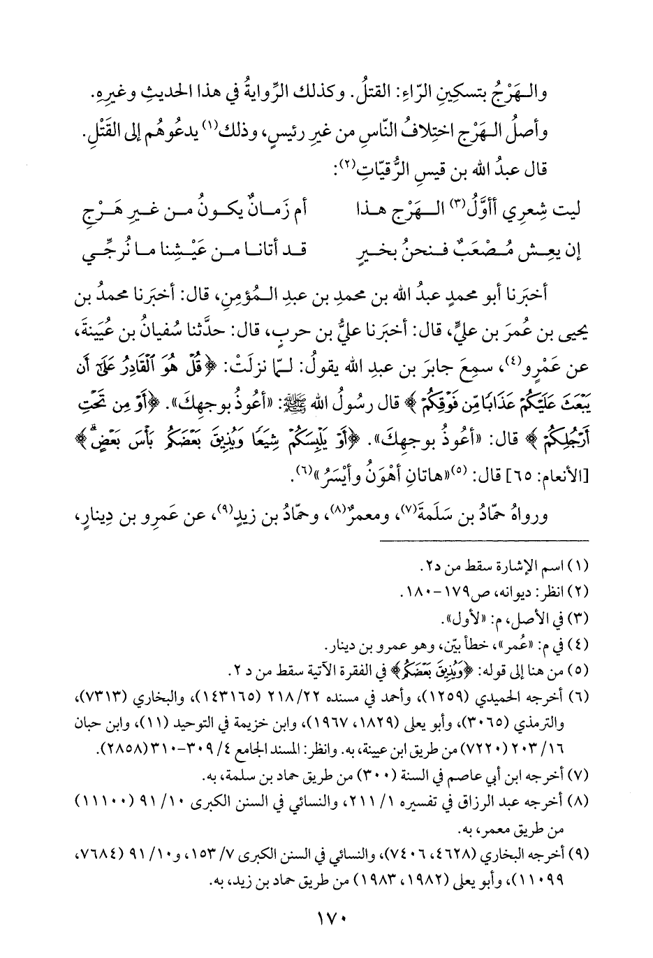 أخبَرنا أبو محمدٍ عبدُ الله بن محمدِ بن عبدِ المُؤمِنِ، قال: أخبَرنا محمدُ بن يحيى بن عُمرَ بن عليٍّ، قال: أخبَرنا عليُّ بن حربٍ، قال: حدَّثنا سُفيانُ بن عُيَينةَ، عن عَمْرٍو (¬٤)، سمِعَ جابرَ بن عبدِ الله يقولُ: لمّا نزلَتْ: {قُلْ هُوَ الْقَادِرُ عَلَى أَنْ يَبْعَثَ عَلَيْكُمْ عَذَابًا مِنْ فَوْقِكُمْ} قال رسُولُ الله - صلى الله عليه وسلم -: "أعُوذُ بوجهِكَ". {أَوْ مِنْ تَحْتِ أَرْجُلِكُمْ} قال: "أعُوذُ بوجهِكَ". {أَوْ يَلْبِسَكُمْ شِيَعًا وَيُذِيقَ بَعْضَكُمْ بَأْسَ بَعْضٍ} [الأنعام: ٦٥] قال: (¬٥) "هاتانِ أهْوَنُ وأيْسَرُ" (¬٦).