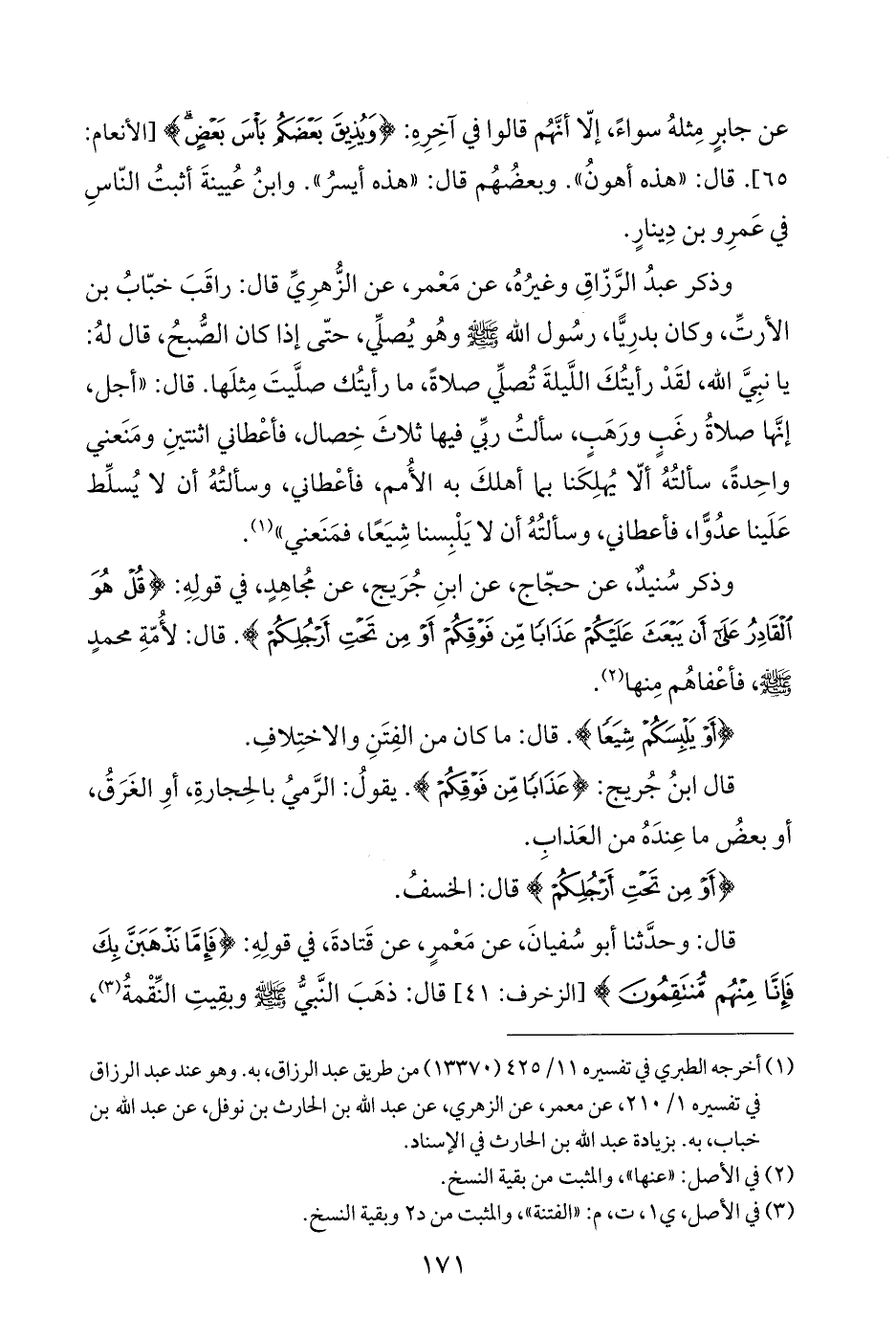 قال: وحدَّثنا أبو سُفيانَ، عن مَعْمرٍ، عن قَتادةَ، في قولِهِ: {فَإِمَّا نَذْهَبَنَّ بِكَ فَإِنَّا مِنْهُمْ مُنْتَقِمُونَ} [الزخرف: ٤١] قال: ذهَبَ النَّبيُّ - صلى الله عليه وسلم - وبقِيتِ النِّقْمةُ (¬٣)،