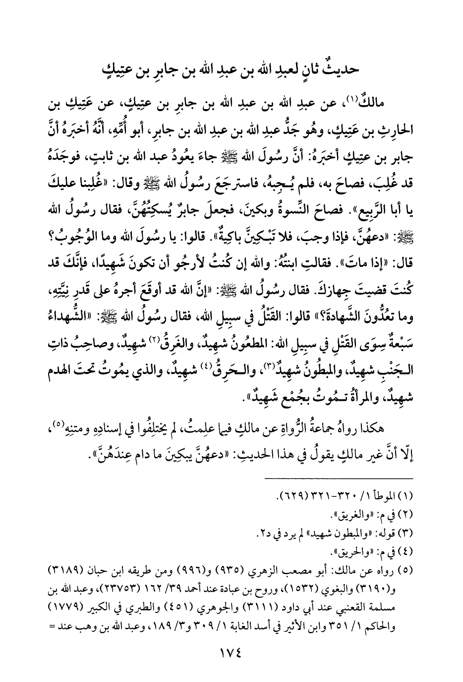 مالكٌ (¬١)، عن عبدِ الله بن عبدِ الله بن جابرِ بن عتِيكٍ، عن عَتِيكِ بن الحارِثِ بن عَتِيكٍ، وهُو جَدُّ عبدِ الله بن عبدِ الله بن جابرِ، أبو أُمِّهِ، أنَّهُ أخبَرهُ أنَّ جابر بن عتِيكٍ أخبَرهُ: أنَّ رسُولَ الله - صلى الله عليه وسلم - جاءَ يعُودُ عبد الله بن ثابتٍ، فوجَدَهُ قد غُلِبَ، فصاحَ به، فلم يُجِبهُ، فاسترجَعَ رسُولُ الله - صلى الله عليه وسلم - وقال: "غُلِبنا عليكَ يا أبا الرَّبِيع". فصاحَ النِّسوةُ وبكينَ، فجعلَ جابز يُسكِتُهُنَّ، فقال رسُولُ الله - صلى الله عليه وسلم -: "دعهُنَّ، فإذا وجبَ، فلا تَبْكِينَّ باكيةٌ". قالوا: يا رسُولَ الله وما الوُجُوبُ؟ قال: "إذا ماتَ". فقالتِ ابنتُهُ: والله إن كنتُ لأرجُو أن تكونَ شَهِيدًا، فإنَّكَ قد كُنتَ قضيتَ جِهازكَ. فقال رسُولُ الله - صلى الله عليه وسلم -: "إنَّ الله قد أوقَعَ أجرهُ على قَدرِ نِيَّتِهِ، وما تعُدُّونَ الشَّهادةَ؟ " قالوا: القَتْلُ في سبِيلِ الله، فقال رسُولُ الله - صلى الله عليه وسلم -: "الشُّهداءُ سبْعة سِوَى القَتْلِ في سبِيلِ الله: المطعُونُ شهِيدٌ، والغَرِقُ (¬٢) شهِيدٌ، وصاحِبُ ذاتِ الجَنْبِ شهِيدٌ، والمبطُونُ شهِيدٌ (¬٣)، والحَرِقُ (¬٤) شهِيدٌ، والذي يمُوتُ تحتَ الهدم شهِيدٌ، والمرأةُ تمُوتُ بجُمْع شَهِيدٌ".