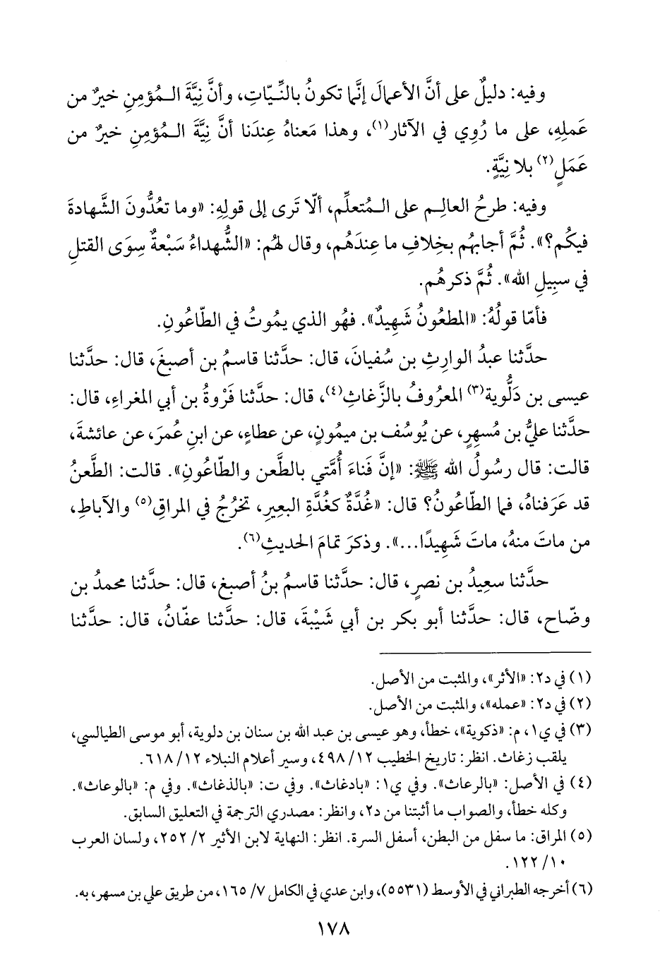 حدَّثنا عبدُ الوارِثِ بن سُفيانَ، قال: حدَّثنا قاسمُ بن أصبغَ، قال: حدَّثنا عيسى بن دَلُّوية (¬٣) المعرُوفُ بالزَّغاثِ (¬٤)، قال: حدَّثنا فَرْوةُ بن أبي المغراءِ، قال: حدَّثنا عليُّ بن مُسهِرٍ، عن يُوسُف بن ميمُونٍ، عن عطاءٍ، عن ابنِ عُمرَ، عن عائشةَ، قالت: قال رسُولُ الله - صلى الله عليه وسلم -: "إنَّ فَناءَ أُمَّتي بالطَّعن والطّاعُونِ". قالت: الطَّعنُ قد عَرَفناهُ، فما الطّاعُونُ؟ قال: "غُدَّةٌ كغُدَّةِ البعِيرِ، تخرُجُ في المراقِ (¬٥) والآباطِ، من ماتَ منهُ، ماتَ شَهِيدًا. . .". وذكرَ تمامَ الحديثِ (¬٦).