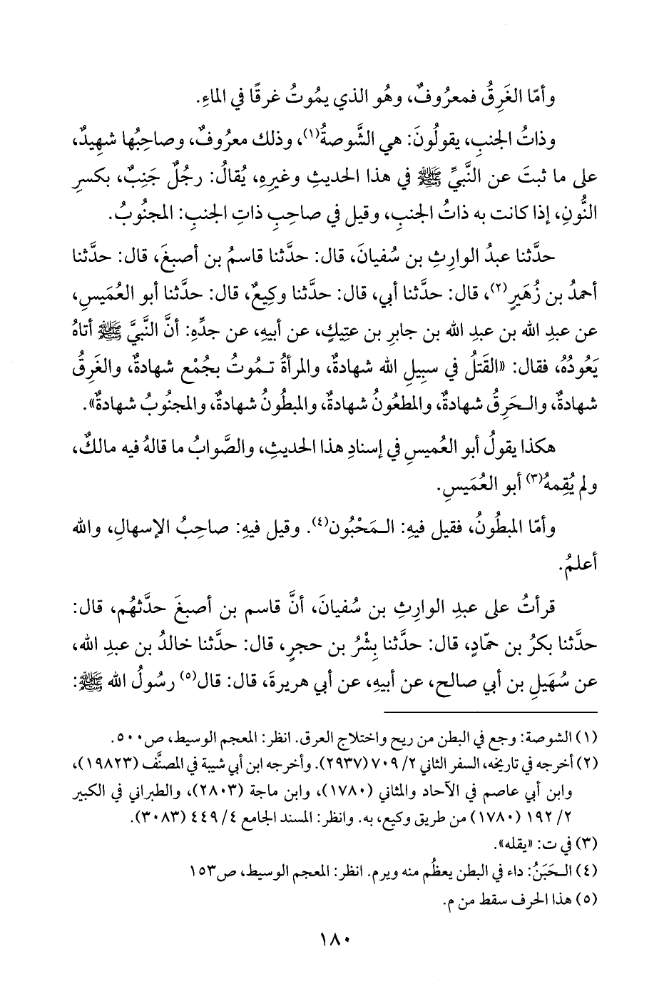 وأمّا المبطُونُ، فقيل فيهِ: المَحْبُون (¬٤). وقيل فيهِ: صاحِبُ الإسهالِ، والله أعلمُ.