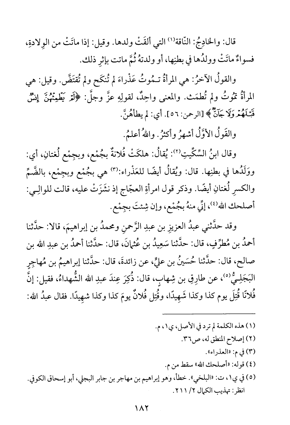 وقد حدَّثني عبدُ العزيزِ بن عبدِ الرَّحمنِ ومحمدُ بن إبراهيمَ، قالا: حدَّثنا أحمدُ بن مُطرِّفٍ، قال: حدَّثنا سَعِيدُ بن عُثمانَ، قال: حدَّثنا أحمدُ بن عبدِ الله بن صالح، قال: حدَّثنا حُسَينُ بن عليٍّ، عن زائدةَ، قال: حدَّثنا إبراهيمُ بن مُهاجِرٍ البَجَلِيُّ (¬٥)، عن طارِقِ بن شِهابٍ، قال: ذُكِرَ عِندَ عبدِ الله الشُّهداءُ، فقيل: إنَّ فُلانًا قُتِلَ يوم كذا وكذا شَهِيدًا، وقُتِل فُلانٌ يومَ كذا وكذا شهِيدًا. فقال عبدُ الله: