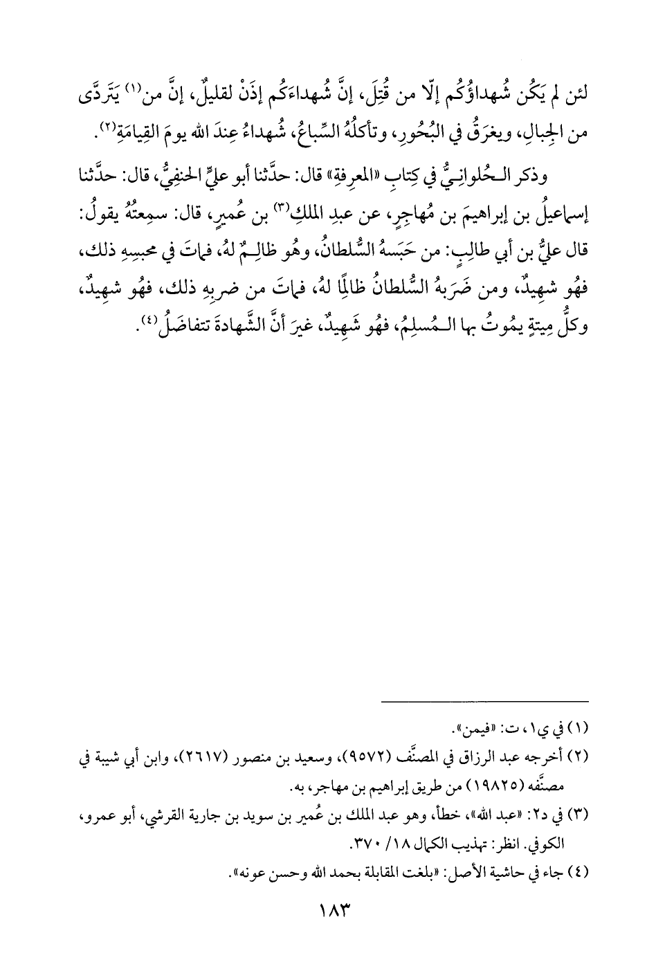 وذكر الحُلوانِيُّ في كِتابِ "المعرِفةِ" قال: حدَّثنا أبو عليٍّ الحنفِيُّ، قال: حدَّثنا إسماعيلُ بن إبراهيمَ بن مُهاجِرٍ، عن عبدِ الملكِ (¬٣) بن عُميرٍ، قال: سمِعتُهُ يقولُ: قال عليُّ بن أبي طالِبٍ: من حَبَسهُ السُّلطانُ، وهُو ظالِم لهُ، فماتَ في محبسِهِ ذلك، فهُو شهِيدٌ، ومن ضَرَبهُ السُّلطانُ ظالِمًا لهُ، فماتَ من ضربِهِ ذلك، فهُو شهِيدٌ، وكلُّ مِيتةٍ يمُوتُ بها المُسلِمُ، فهُو شَهِيدٌ، غيرَ أنَّ الشَّهادةَ تتفاضَلُ (¬٤).