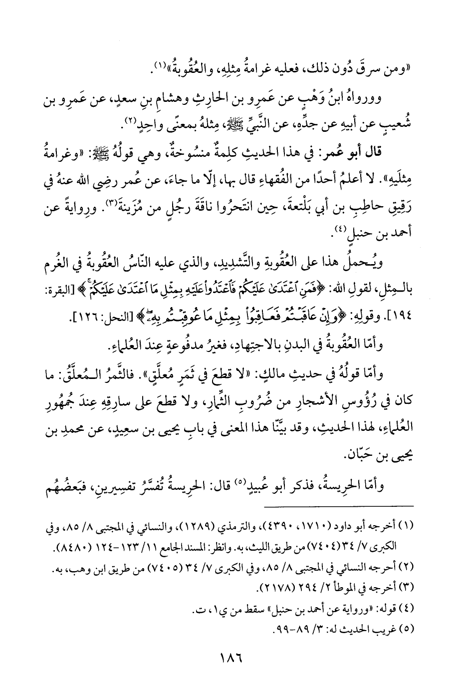 قال أبو عُمر: في هذا الحديثِ كلِمةٌ منسُوخةٌ، وهي قولُهُ - صلى الله عليه وسلم -: "وغرامةُ مِثلَيهِ". لا أعلمُ أحدًا من الفُقهاءِ قال بها، إلّا ما جاءَ، عن عُمر رضِي الله عنهُ في رَقِيقِ حاطِبِ بن أبي بَلْتعةَ، حِين انتَحرُوا ناقَةَ رجُلٍ من مُزَينةَ (¬٣). ورِوايةً عن أحمد بن حنبلٍ (¬٤).
