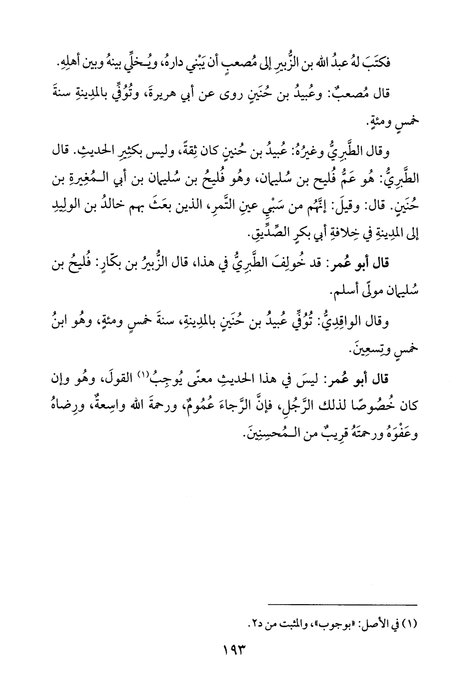 قال مُصعبٌ: وعُبيدُ بن حُنَينٍ روى عن أبي هريرةَ، وتُوُفِّي بالمدِينةِ سنةَ خمسٍ ومئةٍ.