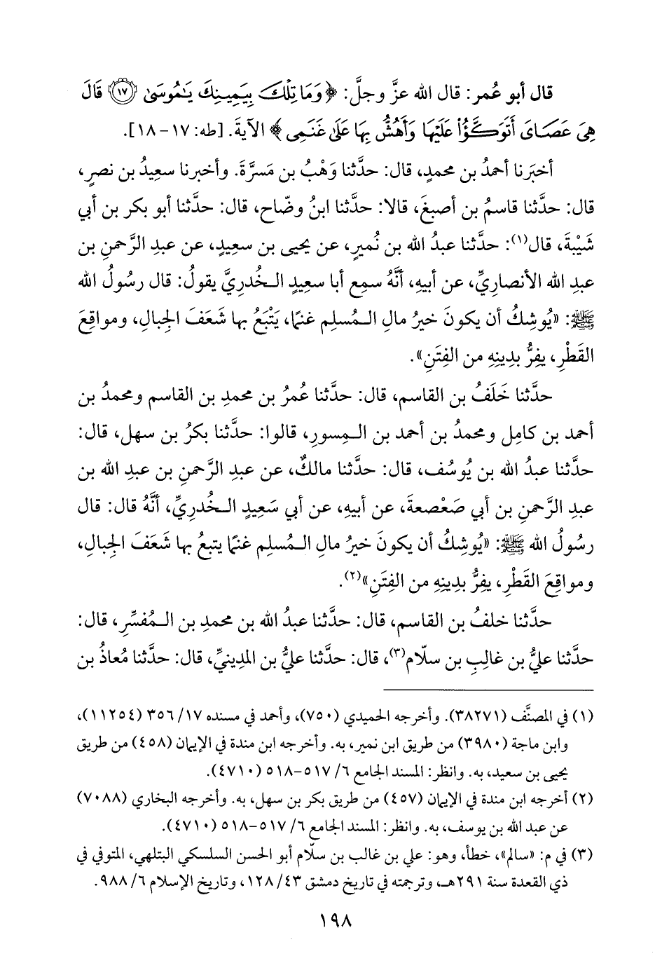 حدَّثنا خَلَفُ بن القاسم، قال: حدَّثنا عُمرُ بن محمدِ بن القاسم ومحمدُ بن أحمد بن كامِل ومحمدُ بن أحمد بن المِسورِ، قالوا: حدَّثنا بكرُ بن سهل، قال: حدَّثنا عبدُ الله بن يُوسُف، قال: حدَّثنا مالكٌ، عن عبدِ الرَّحمنِ بن عبدِ الله بن عبدِ الرَّحمنِ بن أبي صَعْصعةَ، عن أبيهِ، عن أبي سَعِيدٍ الخُدرِيِّ، أنَّهُ قال: قال رسُولُ الله - صلى الله عليه وسلم -: "يُوشِكُ أن يكونَ خيرُ مالِ المُسلِم غنمًا يتبعُ بها شَعَفَ الجِبالِ، ومواقِعَ القَطْرِ، يفِرُّ بدِينِهِ من الفِتَنِ" (¬٢).