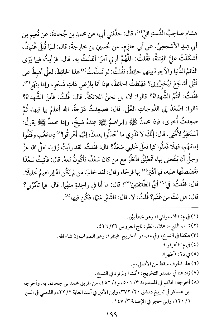 هشام صاحِبُ الدَّستوائيِّ (¬١)، قال: حدَّثني أبي، عن محمدِ بن جُحادةَ، عن نُعيم بن أبي هِندٍ الأشجعِيِّ، عن أبي حازِم، عن حُسينِ بن خارِجةَ، قال: لمّا قُتِلَ عُثمانُ، أشكَلَتْ عليَّ الفِتنةُ، فقُلتُ: اللَّهُمَّ أرِني أمرًا أتمسَّكُ به. قال: فرَأيتُ فيما يَرَى النّائمُ الدُّنيا والآخِرةَ بينهما حائِطٌ، فقُلتُ: لو تَسنَّمتُ (¬٢) هذا الحائطَ، لعلِّي أهبِطُ على قَتْلَى أشجَعَ فيُخبِرُوني؟ فهَبَطتُ الحائطَ، فإذا أنا بأرْضٍ ذاتِ شَجَرٍ، وإذا بنَهَرٍ (¬٣)، فقُلتُ: أنتُمُ الشُّهداءُ؟ قالوا: لا، بل نحنُ الملائكةُ. قال: قُلتُ: فأينَ الشُّهداءُ؟ قالوا: اصْعَدْ إلى الدَّرجاتِ العُلَى. قال: فصعِدتُ دَرَجةً، الله أعلمُ بما فيها، ثُمَّ صعِدتُ أُخرى، فإذا محمدٌ - صلى الله عليه وسلم - وإبراهيمُ - صلى الله عليه وسلم - عِندهُ شيخٌ، وإذا محمدٌ - صلى الله عليه وسلم - يقولُ: أسْتَغفِرُ لأُمَّتِي. قال: إنَّكَ لا تَدْرِي ما أحْدَثُوا بعدكَ، إنَّهُم أهْراقُوا (¬٤) دِماءَهُم، وقَتَلُوا إمامَهُم، فهلّا فَعلُوا كما فعلَ خَليلي سَعْدٌ؟ قال: فقُلتُ: لقد رأيتُ رُؤيا، لعلَّ الله عزَّ وجلَّ أن يَنْفعني بها، أنْطلِقُ فأنظُرُ مع من كان سَعْدٌ، فأكُونُ مَعهُ. قال: فأتيتُ سَعْدًا فقَصَصتُها عليه، فما أكْبَرَ (¬٥) بها فرحًا، وقال: لقد خابَ من لم يَكُن لهُ إبراهيمُ خَليلًا. قال: فقُلتُ: في (¬٦) أيِّ الطّائفتينِ (¬٧)؟ قال: ما أنا في واحِدةٍ منهُما. قال: فما تأمُرُني؟ قال: هل لكَ من غَنَم؟ قُلتُ: لا. قال: فاشْتَرِ غنمًا، فكُن فيها (¬٨).