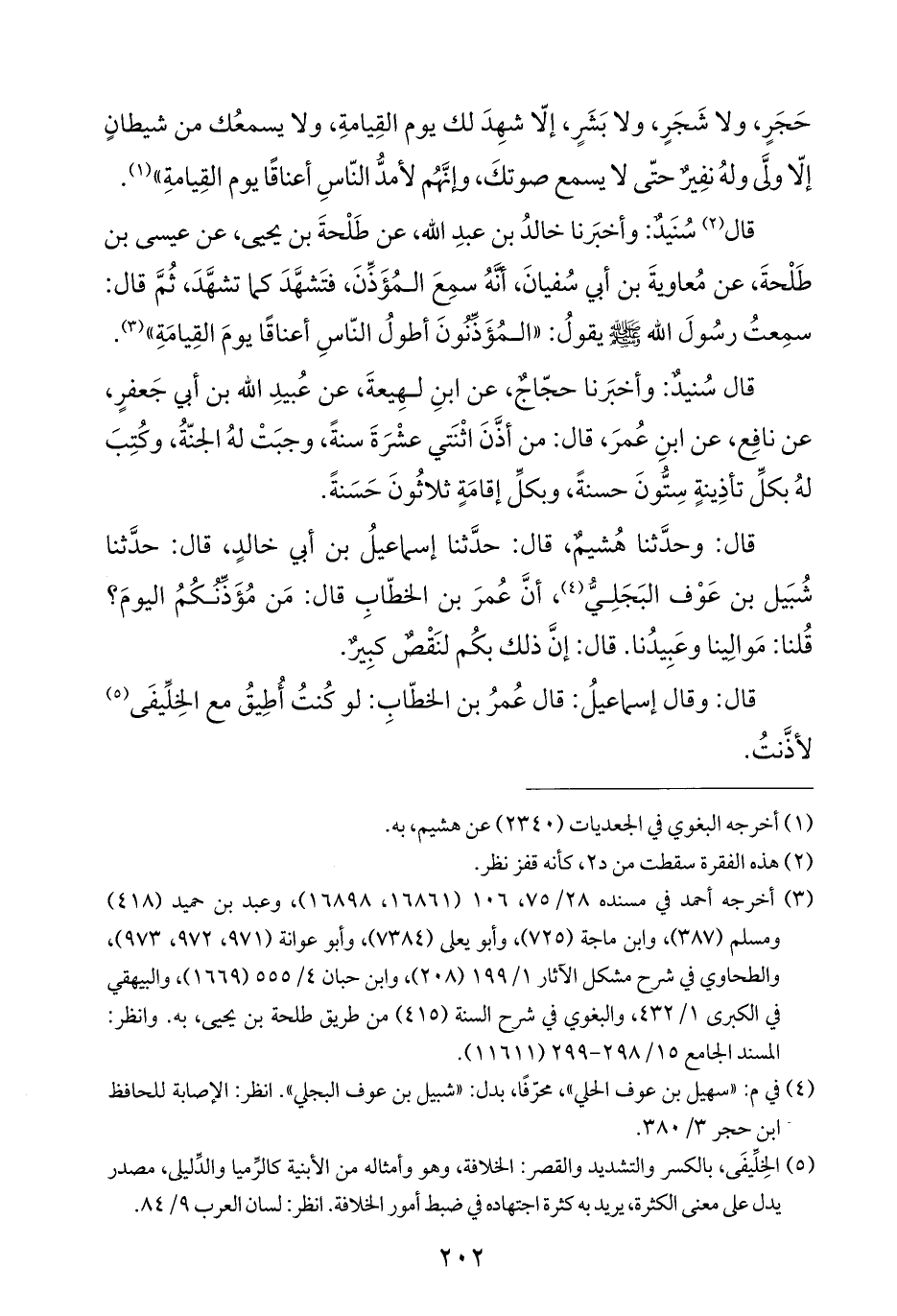 قال (¬٢) سُنَيدٌ: وأخبَرنا خالدُ بن عبدِ الله، عن طَلْحةَ بن يحيى، عن عيسى بن طَلْحةَ، عن مُعاويةَ بن أبي سُفيانَ، أنَّهُ سمِعَ المُؤَذِّنَ، فتَشهَّدَ كما تشهَّدَ، ثُمَّ قال: سمِعتُ رسُولَ الله - صلى الله عليه وسلم - يقولُ: "المُؤَذِّنُونَ أطولُ النّاسِ أعناقًا يومَ القِيامَةِ" (¬٣).