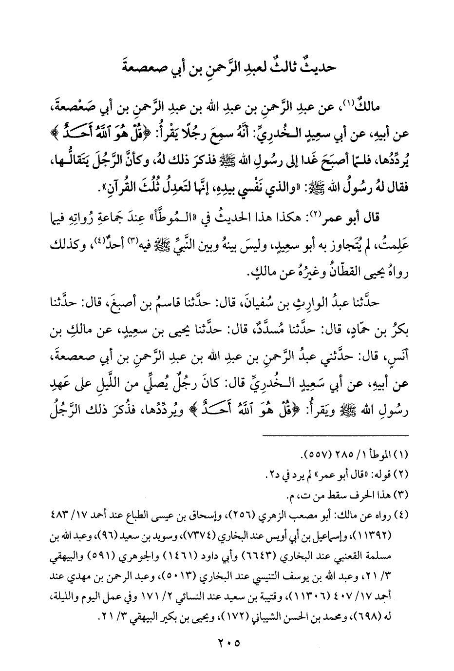 مالكٌ (¬١)، عن عبدِ الرَّحمنِ بن عبدِ الله بن عبدِ الرَّحمنِ بن أبي صَعْصعةَ، عن أبيهِ، عن أبي سعِيدٍ الخُدرِيِّ: أنَّهُ سمِعَ رجُلًا يَقْرأُ: {قُلْ هُوَ اللَّهُ أَحَدٌ} يُردِّدُها، فلمّا أصبَحَ غَدا إلى رسُولِ الله - صلى الله عليه وسلم - فذكرَ ذلك لهُ، وكأنَّ الرَّجُلَ يَتَقالُّها، فقال لهُ رسُولُ الله - صلى الله عليه وسلم -: "والذي نَفْسي بيدِهِ، إنَّها لتَعدِلُ ثُلُثَ القُرآنِ".