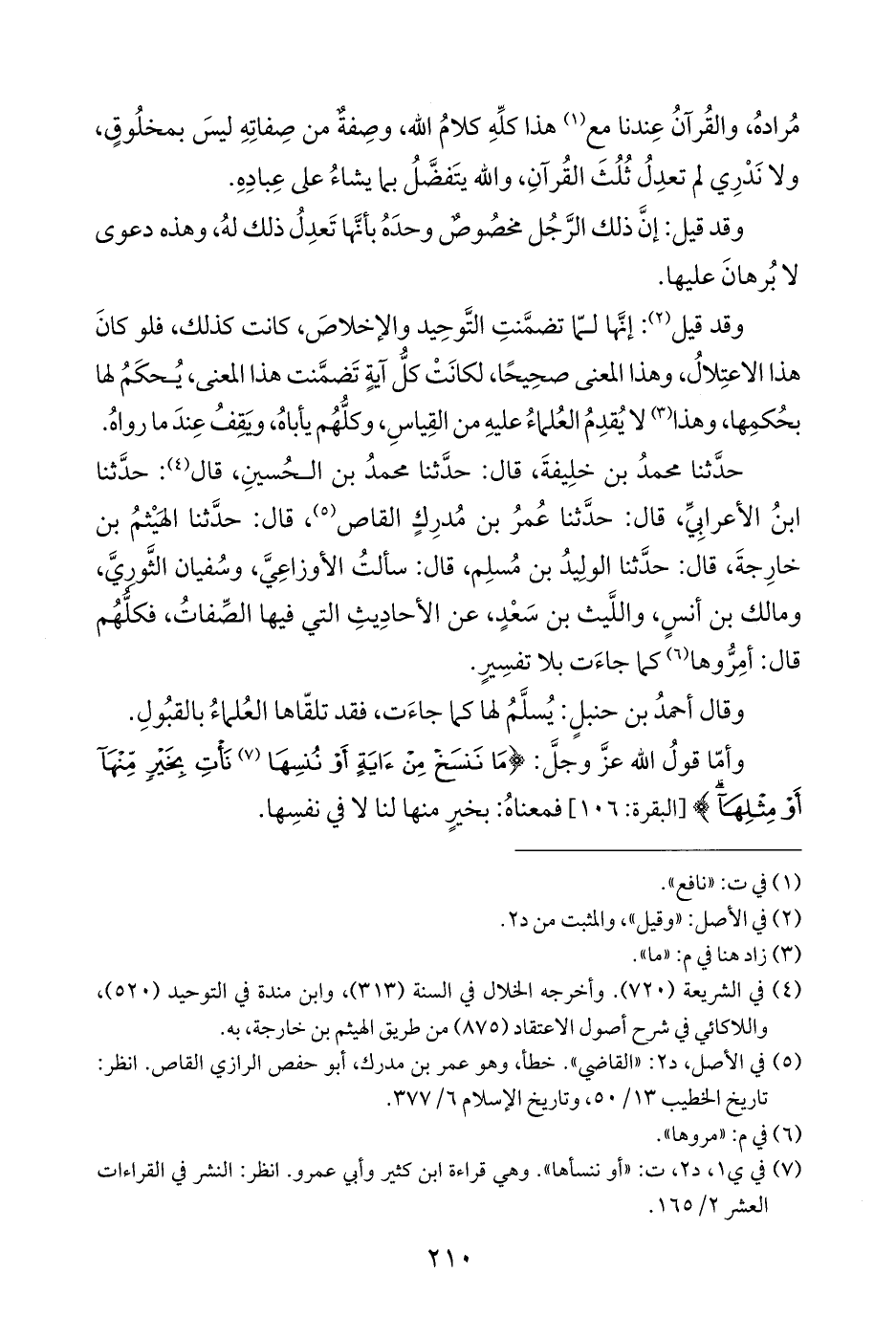 حدَّثنا محمدُ بن خلِيفةَ، قال: حدَّثنا محمدُ بن الحُسينِ، قال (¬٤): حدَّثنا ابنُ الأعرابِيِّ، قال: حدَّثنا عُمرُ بن مُدرِكٍ القاص (¬٥)، قال: حدَّثنا الهَيْثمُ بن خارِجةَ، قال: حدَّثنا الولِيدُ بن مُسلِم، قال: سألتُ الأوزاعِيَّ، وسُفيان الثَّورِيَّ، ومالك بن أنسٍ، واللَّيث بن سَعْدٍ، عن الأحادِيثِ التي فيها الصِّفاتُ، فكلُّهُم قال: أمِرُّوها (¬٦) كما جاءَت بلا تفسِيرٍ.