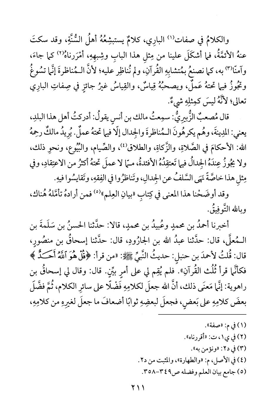 والكلامُ في صفات (¬١) البارِي، كلامٌ يستبشِعُهُ أهلُ السُّنَّةِ، وقد سكتَ عنهُ الأئمَّةُ، فما أشكَلَ علينا من مِثلِ هذا البابِ وشِبهِهِ، أمْرَرناهُ (¬٢) كما جاءَ، وآمنّا (¬٣) به، كما نصنعُ بمُتشابِهِ القُرآنِ، ولم نُناظِر عليه؛ لأنَّ المُناظرةَ إنَّما تسُوغُ وتجُوزُ فيما تحتهُ عَملٌ، ويصحبُهُ قِياسٌ، والقِياسُ غيرُ جائزٍ في صِفاتِ البارِي تعالى؛ لأنَّهُ ليسَ كمِثلِهِ شيءٌ.