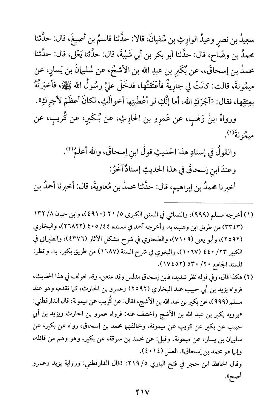 سعِيدُ بن نصرٍ وعبدُ الوارِثِ بن سُفيانَ، قالا: حدَّثنا قاسمُ بن أصبغَ، قال: حدَّثنا محمدُ بن وضّاح، قال: حدَّثنا أبو بكر بن أبي شَيْبةَ، قال: حدَّثنا يَعْلى، قال: حدَّثنا محمدُ بن إسحاقَ،، عن بُكَيرِ بن عبدِ الله بن الأشجِّ، عن سُليمانَ بن يَسارٍ، عن ميمُونةَ، قالت: كانَتْ لي جارِيةٌ فأعْتَقتُها، فدخَلَ عليَّ رسُولُ الله - صلى الله عليه وسلم -، فأخبَرتُهُ بعِتقِها، فقال: "آجَرَكِ الله، أما إنَّكِ لو أعْطَيتها أخوالَكِ، لكانَ أعظَمَ لأجرِكِ".