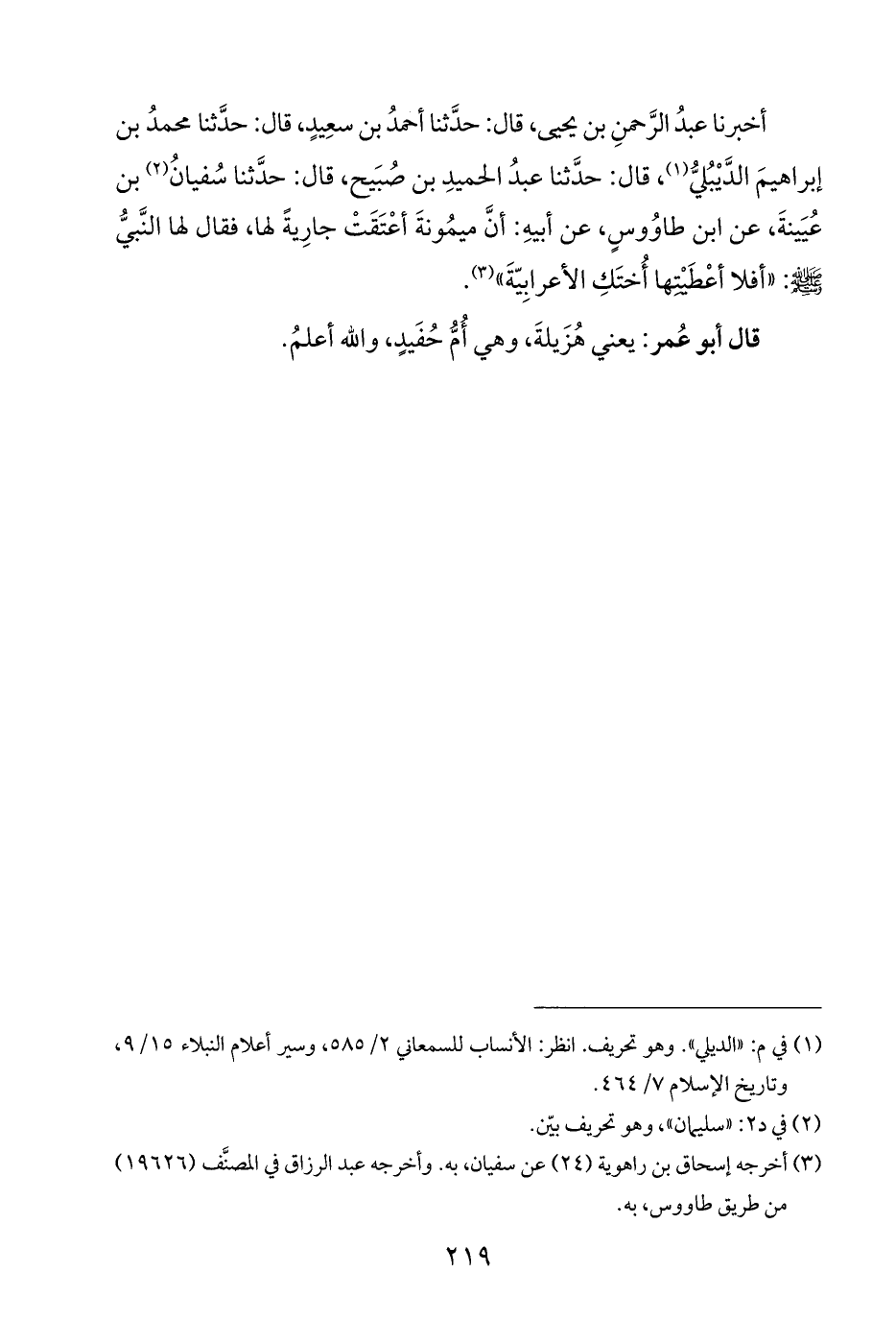 أخبرنا عبدُ الرَّحمنِ بن يحيى، قال: حدَّثنا أحمدُ بن سعِيدٍ، قال: حدَّثنا محمدُ بن إبراهيمَ الدَّيْبُليُّ (¬١)، قال: حدَّثنا عبدُ الحميدِ بن صُبَيح، قال: حدَّثنا سُفيانُ (¬٢) بن عُيَينةَ، عن ابن طاوُوسٍ، عن أبيهِ: أنَّ ميمُونةَ أعْتَقَتْ جارِيةً لها، فقال لها النَّبيُّ - صلى الله عليه وسلم -: "أفلا أعْطَيْتِها أُختَكِ الأعرابِيّةَ" (¬٣).