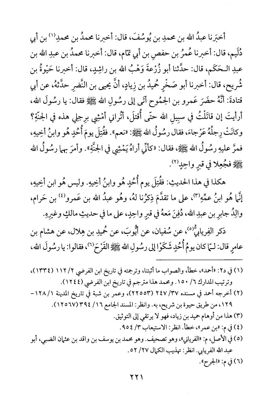 أخبَرنا عبدُ الله بن محمدِ بن يُوسُفَ، قال: أخبرنا محمدُ بن محمدِ (¬١) بن أبي دُلَيم، قال: أخبرنا عُمرُ بن حفصِ بن أبي تمّام، قال: أخبرنا محمدُ بن عبدِ الله بن عبدِ الحَكَم، قال: حدَّثنا أبو زُرْعةَ وَهْبُ الله بن راشِدٍ، قال: أخبرنا حَيْوةُ بن شُريح، قال: أخبرنا أبو صَخْرٍ حُميدُ بن زِيادٍ، أنَّ يحيى بن النَّضِر حدَّثهُ، عن أبي قتادةَ: أنَّهُ حضَرَ عَمرو بن الجمُوح أتى إلى رسُولِ الله - صلى الله عليه وسلم - فقال: يا رسُولَ الله، أرأيتَ إن قاتَلْتُ في سبِيلِ الله حتَّى أُقتلَ، أتُراني أمْشِي برِجِلي هذه في الجنّةِ؟ وكانَتْ رِجلُهُ عَرْجاءَ، فقال رسُولُ الله - صلى الله عليه وسلم -: "نعم". فقُتِلَ يومَ أُحُدٍ هُو وابنُ أخِيهِ، فمرَّ عليهِ رسُولُ الله - صلى الله عليه وسلم -، فقال: "كأنِّي أراهُ يَمْشِي في الجنَّةِ". وأمرَ بهما رسُولُ الله - صلى الله عليه وسلم - فجُعِلا في قبرٍ واحِدٍ (¬٢).