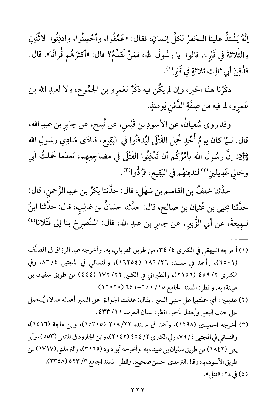 وقد روى سُفيانُ، عن الأسودِ بن قَيْسٍ، عن نُبيح، عن جابرِ بن عبدِ الله، قال: لمّا كان يومُ أُحُدٍ حُمِل القَتْلَى ليُدفنُوا في البَقِيع، فنادَى مُنادِي رسُولِ الله - صلى الله عليه وسلم -: إنَّ رسُولَ الله يأمُرُكُم أن تَدْفِنُوا القَتْلَى في مَضاجِعِهِم، بَعدَما حَملتُ أبي وخالِي عَدِيلينِ (¬٢) لندفِنهُم في البَقِيع، فرُدُّوا (¬٣).