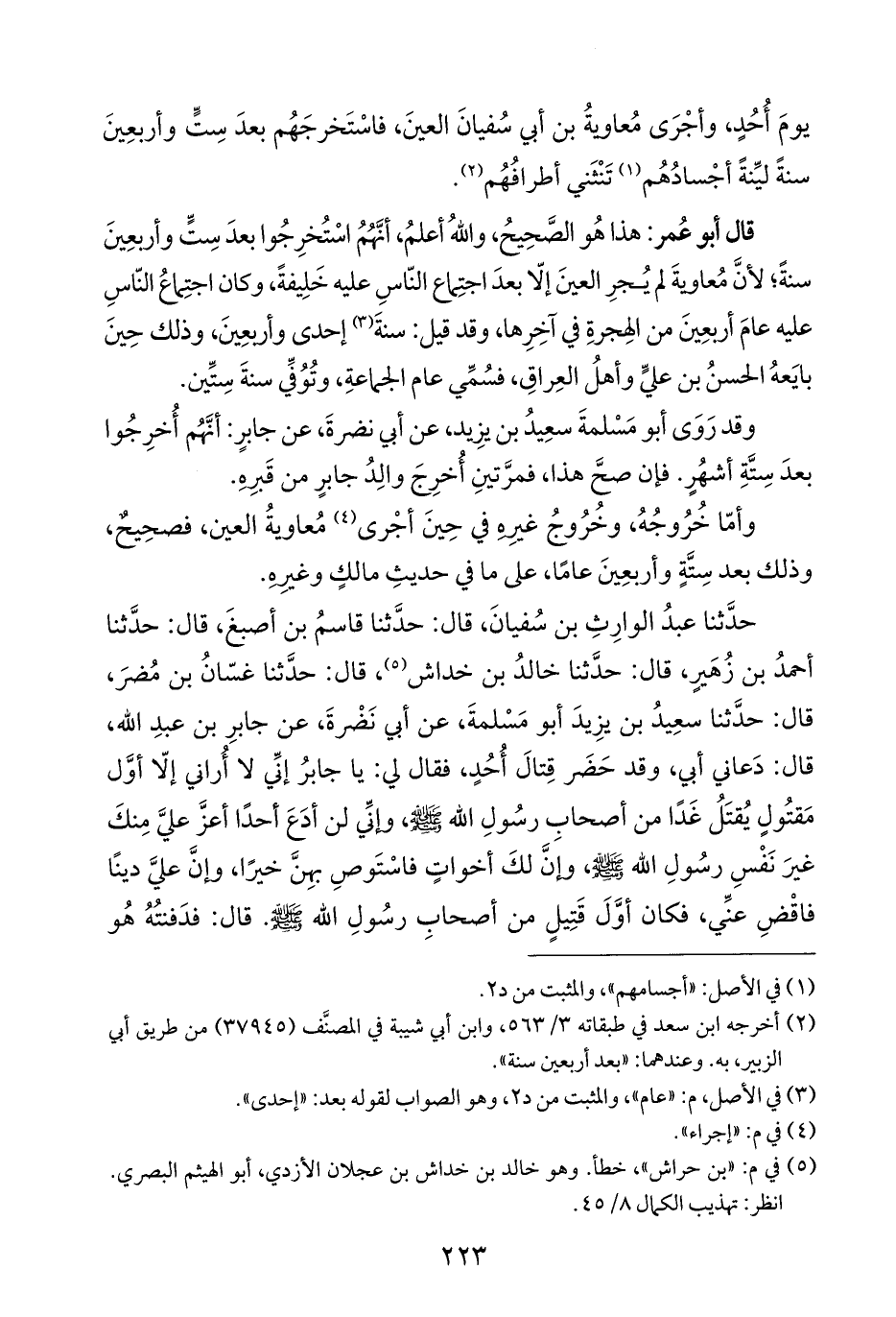 حدَّثنا عبدُ الوارِثِ بن سُفيانَ، قال: حدَّثنا قاسمُ بن أصبغَ، قال: حدَّثنا أحمدُ بن زُهَيرٍ، قال: حدَّثنا خالدُ بن خداش (¬٥)، قال: حدَّثنا غسّانُ بن مُضرَ، قال: حدَّثنا سعِيدُ بن يزِيدَ أبو مَسْلمةَ، عن أبي نَضْرةَ، عن جابرِ بن عبدِ الله، قال: دَعاني أبي، وقد حَضَر قِتالَ أُحُدٍ، فقال لي: يا جابرُ إنِّي لا أُراني إلّا أوَّل مَقتُولٍ يُقتَلُ غَدًا من أصحابِ رسُولِ الله - صلى الله عليه وسلم -، وإنِّي لن أدَعَ أحدًا أعزَّ عليَّ مِنكَ غيرَ نَفْسِ رسُولِ الله - صلى الله عليه وسلم -، وإنَّ لكَ أخواتٍ فاسْتَوصِ بهِنَّ خيرًا، وإنَّ عليَّ دينًا فاقْضِ عنِّي، فكان أوَّلَ قَتِيلٍ من أصحابِ رسُولِ الله - صلى الله عليه وسلم -. قال: فدَفنتُهُ هُو