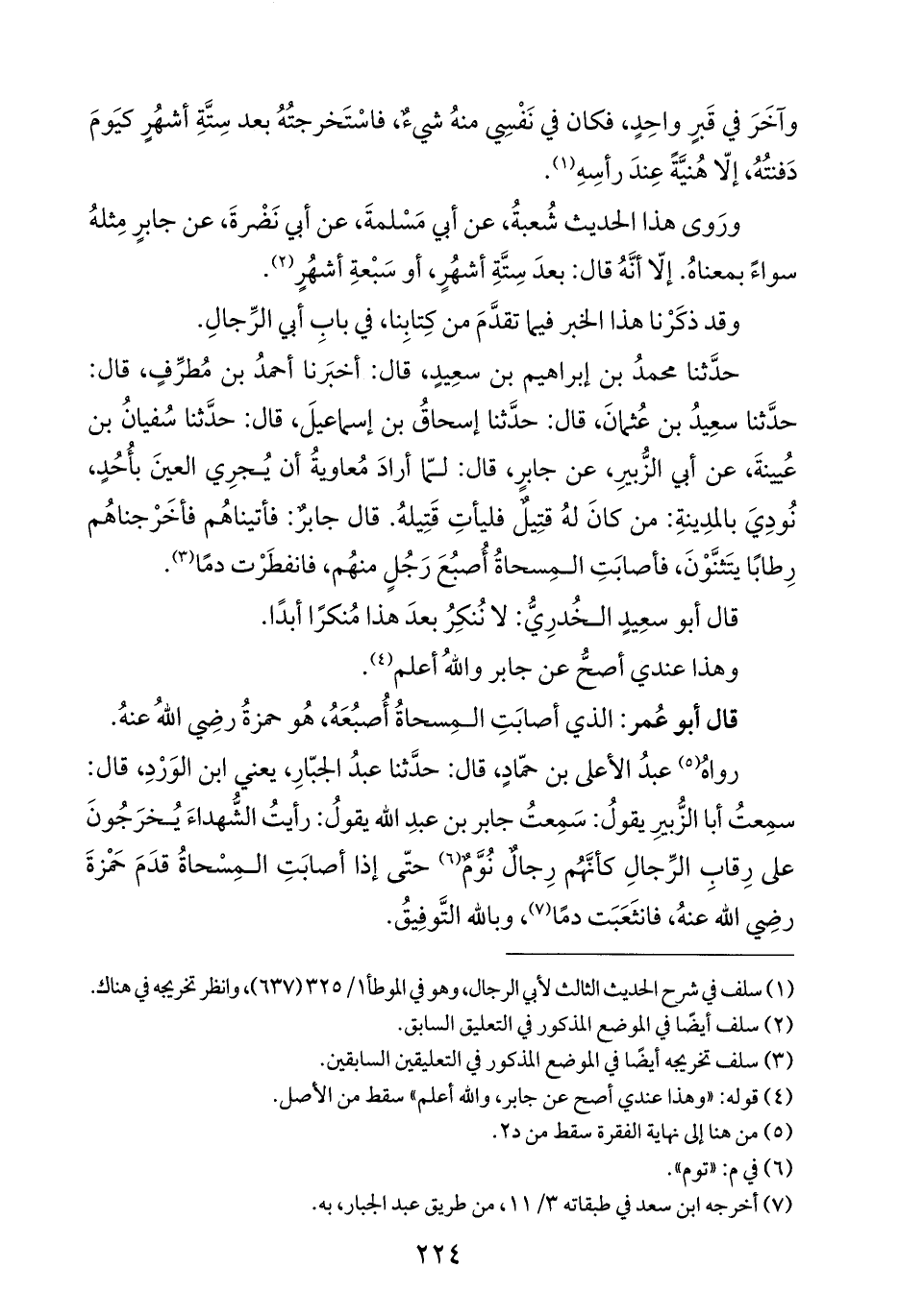 رواهُ (¬٥) عبدُ الأعلى بن حمّادٍ، قال: حدَّثنا عبدُ الجبّارِ، يعني ابن الوَرْدِ، قال: سمِعتُ أبا الزُّبيرِ يقولُ: سَمِعتُ جابر بن عبدِ الله يقولُ: رأيتُ الشُّهداءَ يُخرَجُونَ على رِقابِ الرِّجالِ كأنَّهُم رِجالٌ نُوَّمٌ (¬٦) حتَّى إذا أصابَتِ المِسْحاةُ قدَمَ حَمْزةَ رضِي الله عنهُ، فانثَعَبَت دمًا (¬٧)، وبالله التَّوفِيقُ.