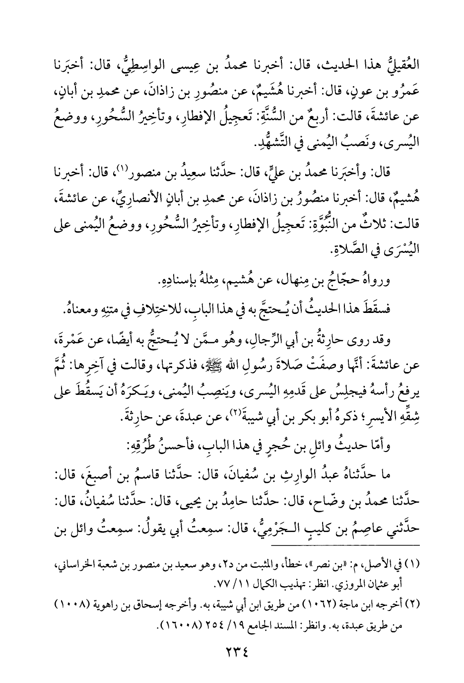العُقيليُّ هذا الحديث، قال: أخبرنا محمدُ بن عِيسى الواسِطِيُّ، قال: أخبَرنا عَمرُو بن عونٍ، قال: أخبرنا هُشَيمٌ، عن منصُورِ بن زاذانَ، عن محمدِ بن أبانٍ، عن عائشةَ، قالت: أربعٌ من السُّنَّةِ: تَعجِيلُ الإفطارِ، وتأخِيرُ السُّحُورِ، ووضعُ اليُسرى، ونَصبُ اليُمنى في التَّشهُّدِ.