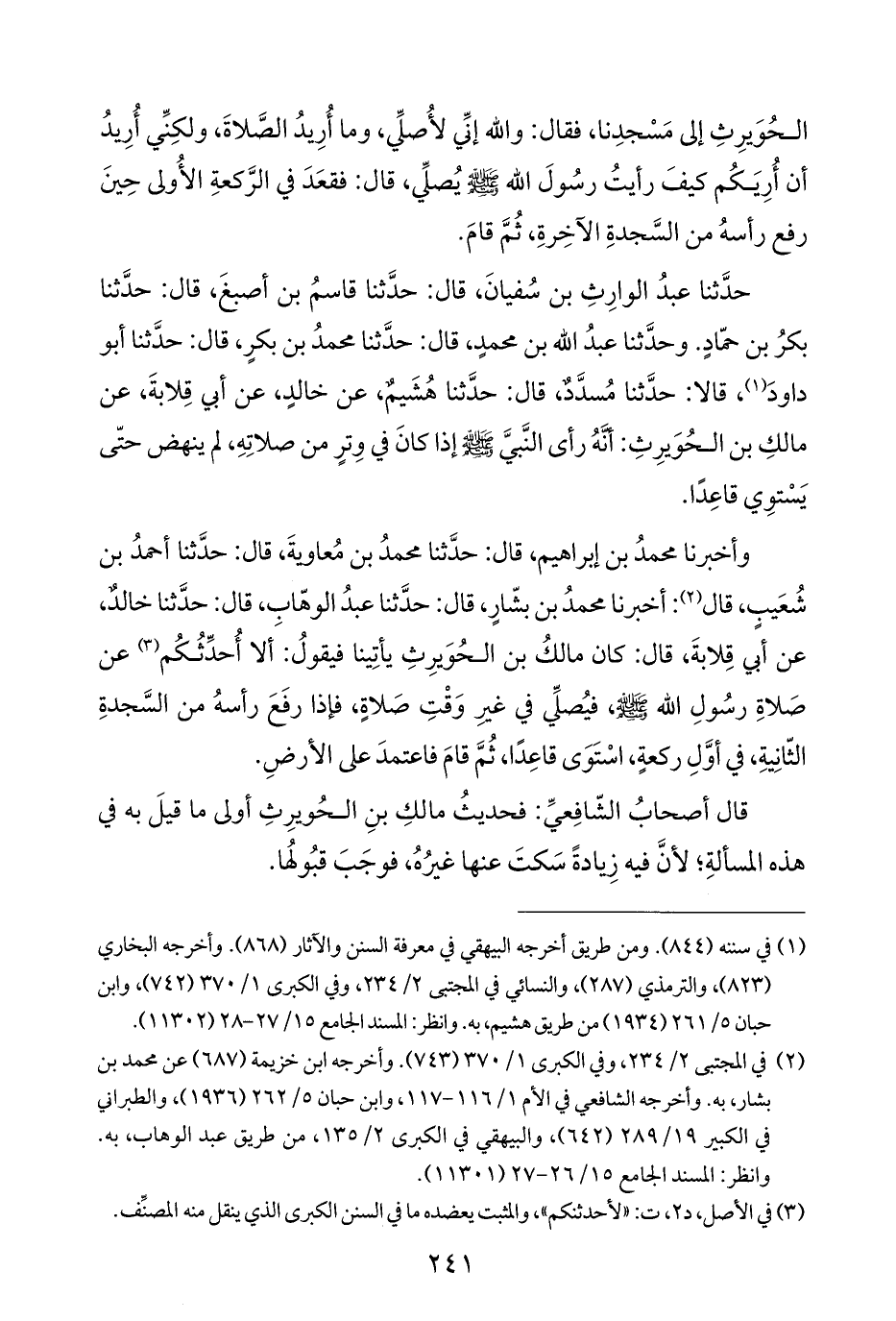 حدَّثنا عبدُ الوارِثِ بن سُفيانَ، قال: حدَّثنا قاسمُ بن أصبغَ، قال: حدَّثنا بكرُ بن حمّادٍ. وحدَّثنا عبدُ الله بن محمدٍ، قال: حدَّثنا محمدُ بن بكرٍ، قال: حدَّثنا أبو داودَ (¬١)، قالا: حدَّثنا مُسدَّدٌ، قال: حدَّثنا هُشَيمٌ، عن خالدٍ، عن أبي قِلابةَ، عن مالكِ بن الحُوَيرِثِ: أنَّهُ رأى النَّبيَّ - صلى الله عليه وسلم - إذا كانَ في وِترٍ من صلاتِهِ، لم ينهض حتَّى يَسْتوِي قاعِدًا.