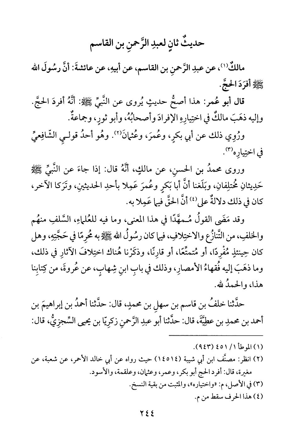 مالكٌ (¬١)، عن عبدِ الرَّحمنِ بن القاسم، عن أبيهِ، عن عائشةَ: أنَّ رسُولَ الله - صلى الله عليه وسلم - أفرَدَ الحجَّ.