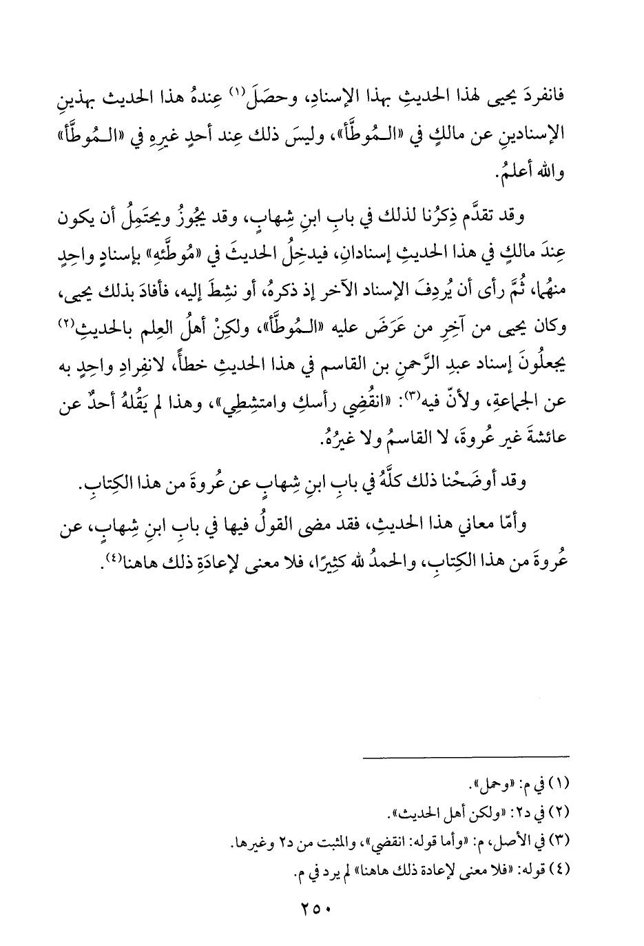 وقد تقدَّم ذِكرُنا لذلك في بابِ ابنِ شِهابٍ، وقد يجُوزُ ويحتَمِلُ أن يكون عِندَ مالكٍ في هذا الحديثِ إسنادانِ، فيدخِلُ الحديثَ في "مُوطَّئهِ" بإسنادٍ واحِدٍ منهُما، ثُمَّ رأى أن يُردِفَ الإسناد الآخر إذ ذكرهُ، أو نشِطَ إليه، فأفادَ بذلك يحيى، وكان يحيى من آخِرِ من عَرَضَ عليه "المُوطَّأ"، ولكِنْ أهلُ العِلم بالحديثِ (¬٢) يجعلُونَ إسناد عبدِ الرَّحمنِ بن القاسم في هذا الحديثِ خطأً، لانفِرادِ واحِدٍ به عن الجماعةِ، ولأنّ فيه (¬٣): "انقُضِي رأسكِ وامتشِطِي"، وهذا لم يَقُلهُ أحدٌ عن عائشةَ غير عُروةَ، لا القاسمُ ولا غيرُهُ.