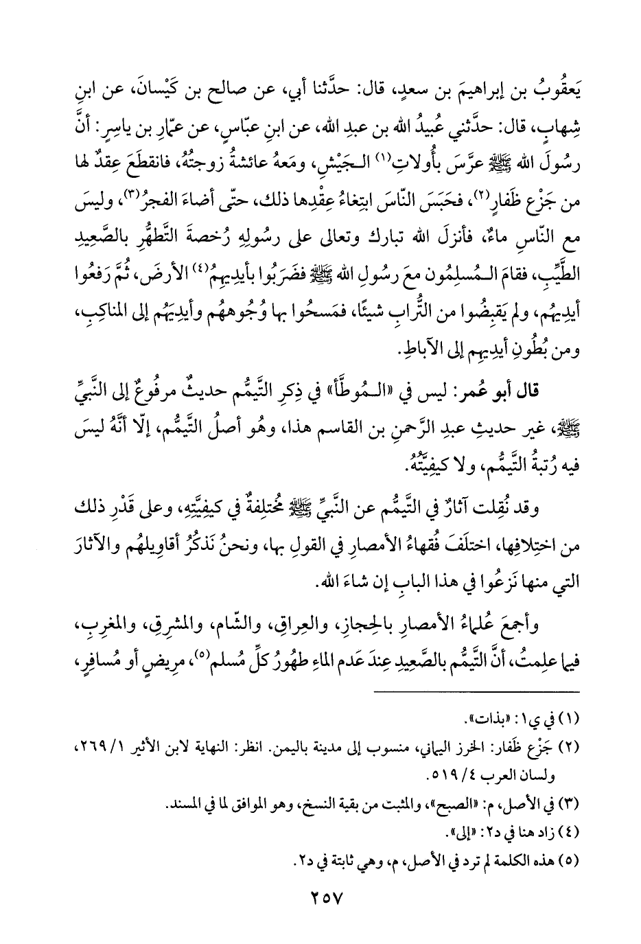 يَعقُوبُ بن إبراهيمَ بن سعدٍ، قال: حدَّثنا أبي، عن صالح بن كَيْسانَ، عن ابنِ شِهابٍ، قال: حدَّثني عُبيدُ الله بن عبدِ الله، عن ابنِ عبّاسٍ، عن عمّارِ بن ياسِرٍ: أنَّ رسُولَ الله - صلى الله عليه وسلم - عرَّسَ بأُولاتِ (¬١) الجَيْشِ، ومَعهُ عائشةُ زوجتُهُ، فانقطَعَ عِقا لها من جَزْع ظَفارٍ (¬٢)، فحَبَسَ النّاسَ ابتِغاءُ عِقْدِها ذلك، حتَّى أضاءَ الفجرُ (¬٣)، وليسَ مع النّاسِ ماءٌ، فأنزلَ الله تبارك وتعالى على رسُولِهِ رُخصةَ التَّطهُّرِ بالصَّعِيدِ الطَّيِّبِ، فقامَ المُسلِمُون معَ رسُولِ الله - صلى الله عليه وسلم - فضَرَبُوا بأيدِيهِمُ (¬٤) الأرضَ، ثُمَّ رَفعُوا أيدِيهُم، ولم يَقبِضُوا من التُّرابِ شيئًا، فمَسحُوا بها وُجُوههُم وأيدِيَهُم إلى المناكِبِ، ومن بُطُونِ أيدِيهِم إلى الآباطِ.
