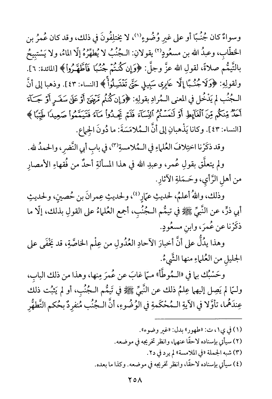 وحَسْبُك بما في "المُوطَّأ" ممّا غابَ عن عُمرَ مِنها، وهذا من ذلك البابِ، ولمّا لم يَصِل إليهما عِلمُ ذلك عن النَّبيِّ - صلى الله عليه وسلم - في تَيمُّم الجُنُبِ، أو لم يَثبُت ذلك عِندَهُما، تأوَّلا في الآيةِ المُحْكَمةِ في الوُضُوءِ، أنَّ الجُنُب مُنفرِد بحُكم التَّطهُّرِ