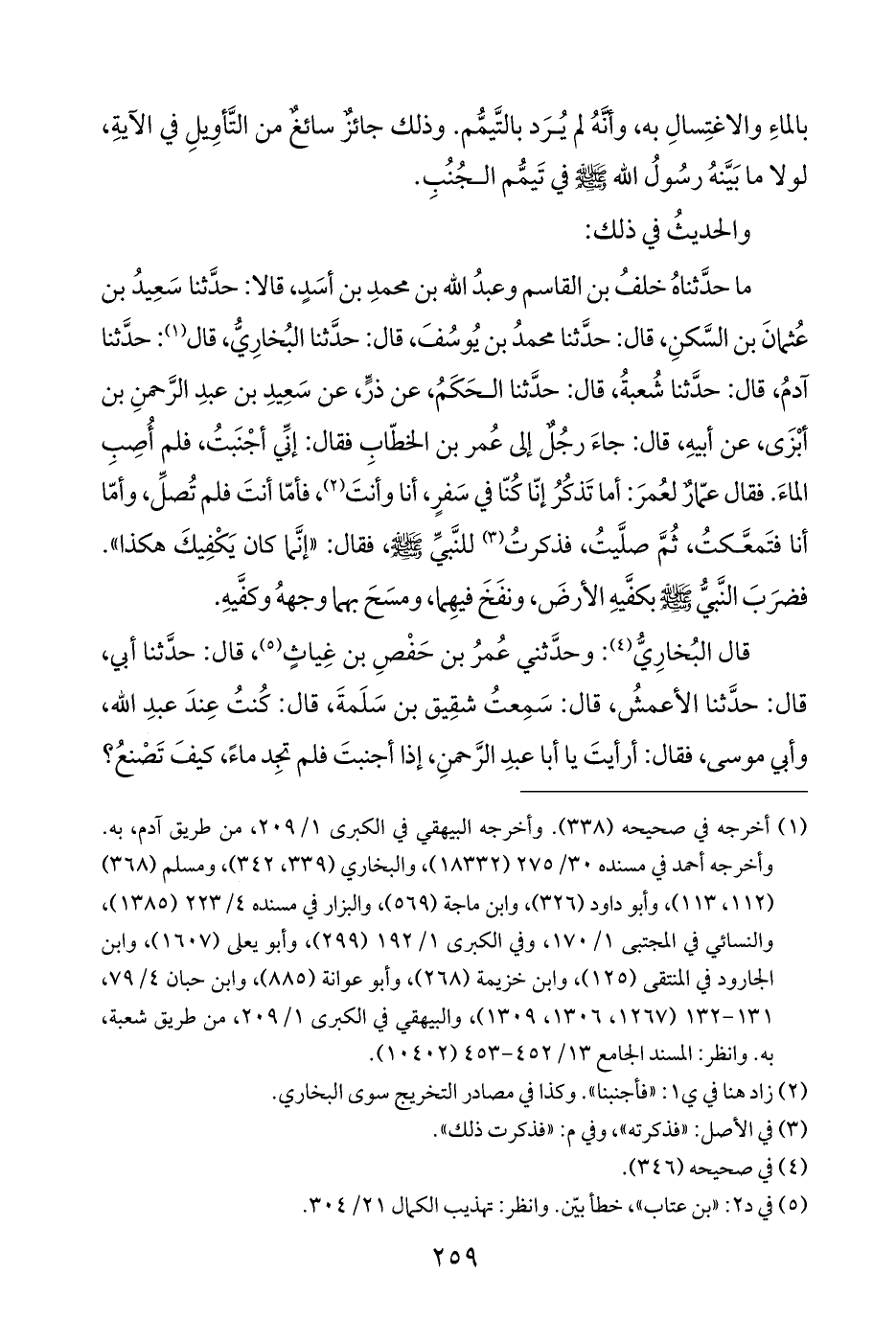 ما حدَّثناهُ خلفُ بن القاسم وعبدُ الله بن محمدِ بن أسَدٍ، قالا: حدَّثنا سَعِيدُ بن عُثمانَ بن السَّكنِ، قال: حدَّثنا محمدُ بن يُوسُفَ، قال: حدَّثنا البُخارِيُّ، قال (¬١): حدَّثنا آدمُ، قال: حدَّثنا شُعبةُ، قال: حدَّثنا الحَكَمُ، عن ذرٍّ، عن سَعِيدِ بن عبدِ الرَّحمنِ بن أبْزَى، عن أبيهِ، قال: جاءَ رجُلٌ إلى عُمر بن الخطّابِ فقال: إنِّي أجْنَبتُ، فلم أُصِبِ الماءَ. فقال عمّارٌ لعُمرَ: أما تَذكُرُ إنّا كُنّا في سَفرٍ، أنا وأنتَ (¬٢)، فأمّا أنتَ فلم تُصلِّ، وأمّا أنا فتَمعَّكتُ، ثُمَّ صلَّيتُ، فذكرتُ (¬٣) للنَّبيِّ - صلى الله عليه وسلم -، فقال: "إنَّما كان يَكْفِيكَ هكذا". فضرَبَ النَّبيُّ - صلى الله عليه وسلم - بكفَّيهِ الأرضَ، ونفَخَ فيهِما، ومسَحَ بهما وجههُ وكفَّيهِ.