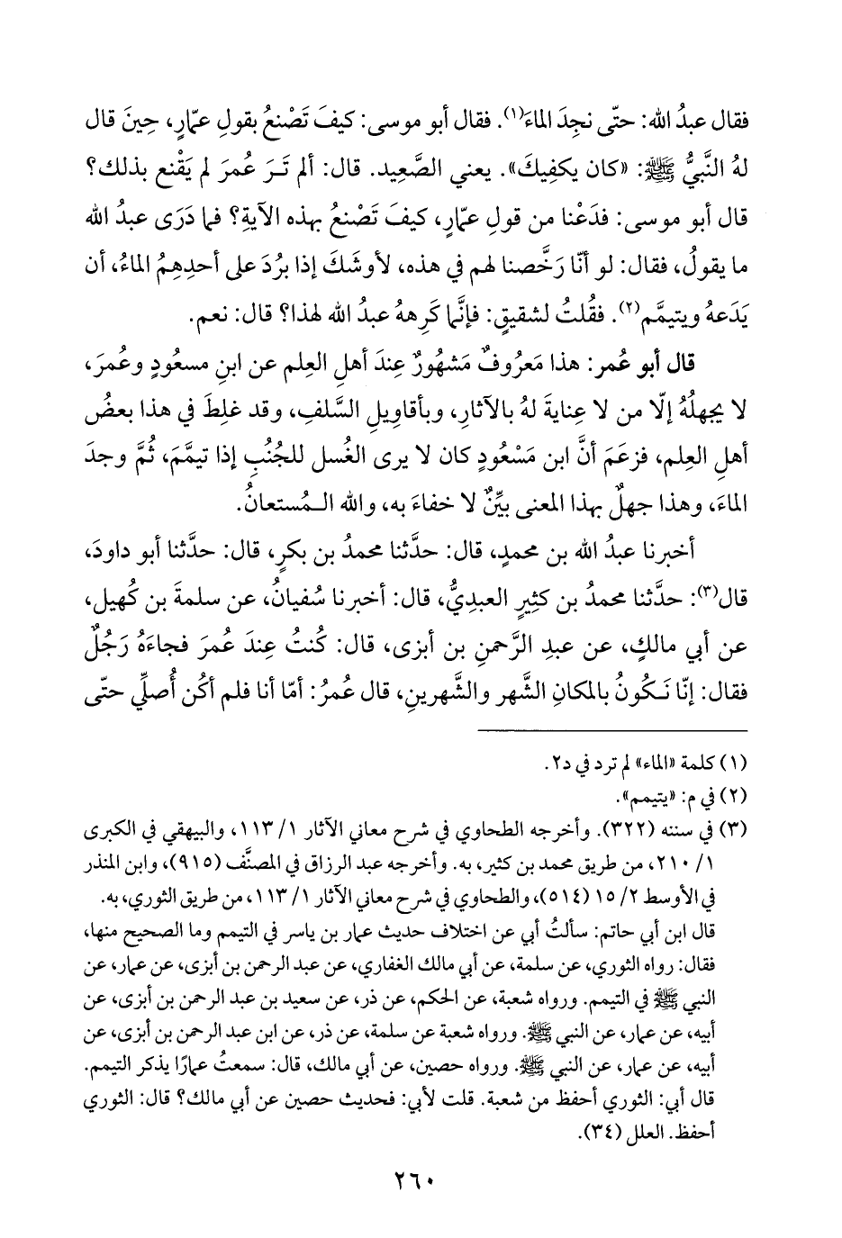 قال أبو عُمر: هذا مَعرُوفٌ مَشهُورٌ عِندَ أهلِ العِلم عن ابنِ مسعُودٍ وعُمرَ، لا يجهلُهُ إلّا من لا عِنايةَ لهُ بالآثارِ، وبأقاوِيلِ السَّلفِ، وقد غلِطَ في هذا بعضُ أهلِ العِلم، فزعَمَ أنَّ ابن مَسْعُودٍ كان لا يرى الغُسل للجُنُبِ إذا تيمَّمَ، ثُمَّ وجدَ الماءَ، وهذا جهلٌ بهذا المعنى بيِّنٌ لا خفاءَ به، والله المُستعانُ.