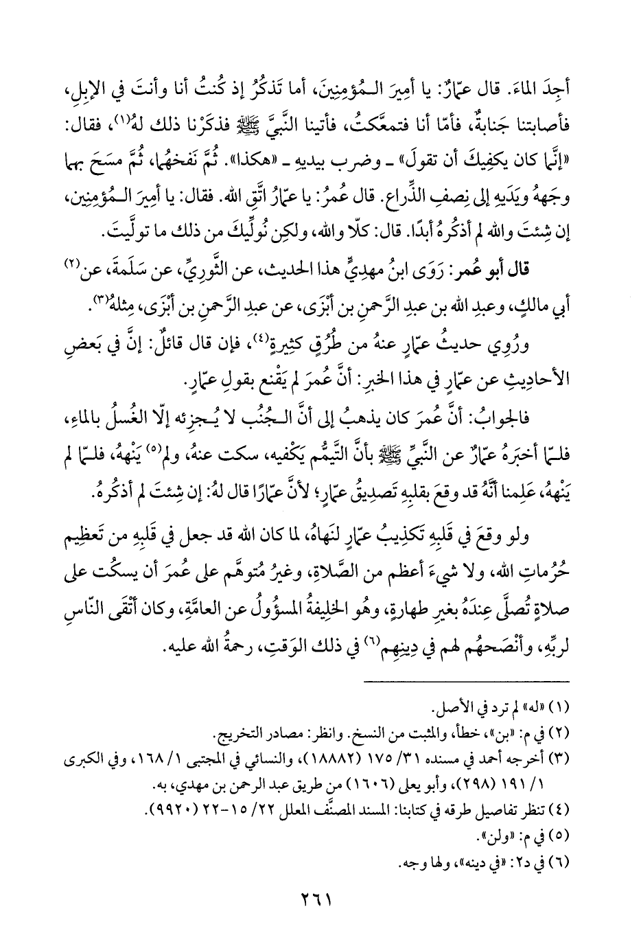 ولو وقعَ في قَلبِهِ تَكذِيبُ عمّارٍ لنَهاهُ، لما كان الله قد جعل في قَلبِهِ من تَعظِيم حُرُماتِ الله، ولا شيءَ أعظم من الصَّلاةِ، وغيرُ مُتوهَّم على عُمرَ أن يسكُت على صلاةٍ تُصلَّى عِندَهُ بغيرِ طهارةٍ، وهُو الخلِيفةُ المسؤُولُ عن العامَّةِ، وكان أتْقَى النّاسِ لربِّهِ، وأنْصَحهُم لهم في دِينِهِم (¬٦) في ذلك الوَقتِ، رحمةُ الله عليه.