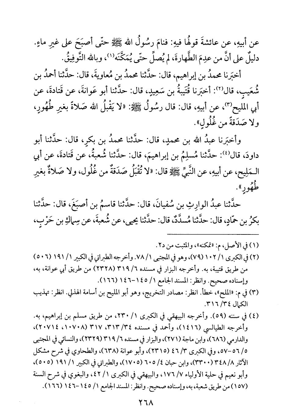 وأخبَرنا عبدُ الله بن محمدٍ، قال: حدَّثنا محمدُ بن بكرٍ، قال: حدَّثنا أبو داودَ، قال (¬٤): حدَّثنا مُسلِمُ بن إبراهيمَ، قال: حدَّثنا شُعبةُ، عن قَتادةَ، عن أبي المَلِيح، عن أبيهِ، عن النَّبيِّ - صلى الله عليه وسلم - قال: "لا تُقْبَلُ صَدَقةٌ من غُلُول، ولا صَلاةٌ بغيرِ طُهُورٍ".