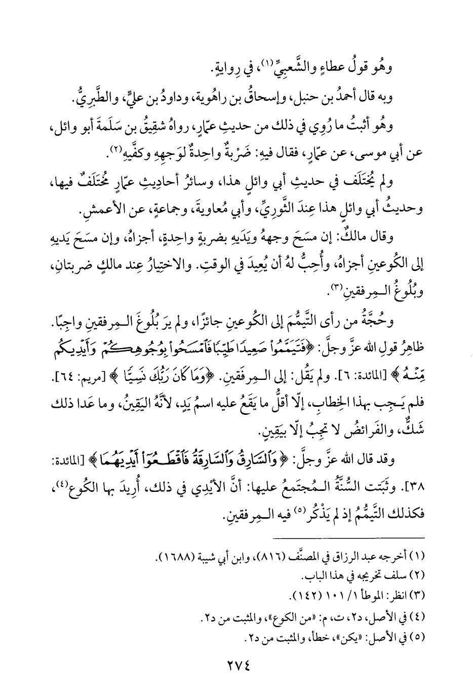 وحُجَّةُ من رأى التَّيمُّمَ إلى الكُوعينِ جائزًا، ولم يرَ بُلُوغَ المِرفقينِ واجِبًا. ظاهِرُ قولِ الله عزَّ وجلَّ: {فَتَيَمَّمُوا صَعِيدًا طَيِّبًا فَامْسَحُوا بِوُجُوهِكُمْ وَأَيْدِيكُمْ مِنْهُ} [المائدة: ٦]. ولم يَقُل: إلى المِرفَقينِ. {وَمَا كَانَ رَبُّكَ نَسِيًّا} [مريم: ٦٤]. فلم يجِب بهذا الخِطابِ، إلّا أقلُّ ما يَقَعُ عليه اسمُ يَدٍ، لأنَّهُ اليَقِينُ، وما عَدا ذلك شَكٌّ، والفَرائضُ لا تجِبُ إلّا بيَقِينٍ.