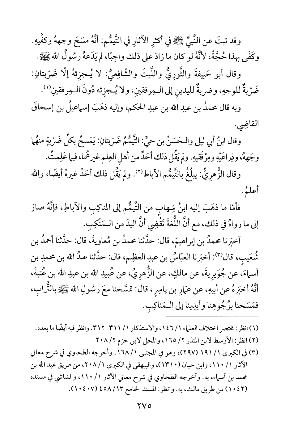 وقد ثبتَ عن النَّبيِّ - صلى الله عليه وسلم - في أكثرِ الآثارِ في التَّيمُّم: أنَّهُ مسَحَ وجههُ وكفَّيهِ. وكَفَى بهذا حُجَّةً، لأنَّهُ لو كان ما زادَ على ذلك واجِبًا، لم يَدَعهُ رسُولُ الله - صلى الله عليه وسلم -.