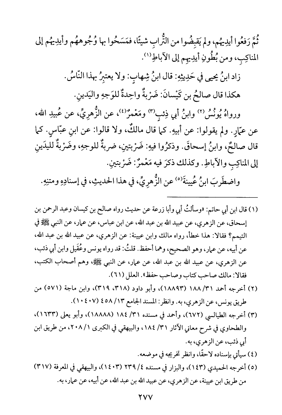 ورواهُ يُونُسُ (¬٢) وابنُ أبي ذِئبٍ (¬٣) ومَعْمر (¬٤)، عن الزُّهرِيِّ، عن عُبيدِ الله، عن عمّارٍ. ولم يقولوا: عن أبيهِ. كما قال مالكٌ، ولا قالوا: عن ابنِ عبّاسٍ. كما قال صالح، وابنُ إسحاقَ. وذكرُوا فيهِ: ضَرْبتينِ، ضربةٌ للوجهِ، وضَرْبةٌ لليدَينِ إلى المناكِبِ والآباطِ. وكذلك ذكرَ فيه مَعْمرٌ: ضَرْبتينِ.