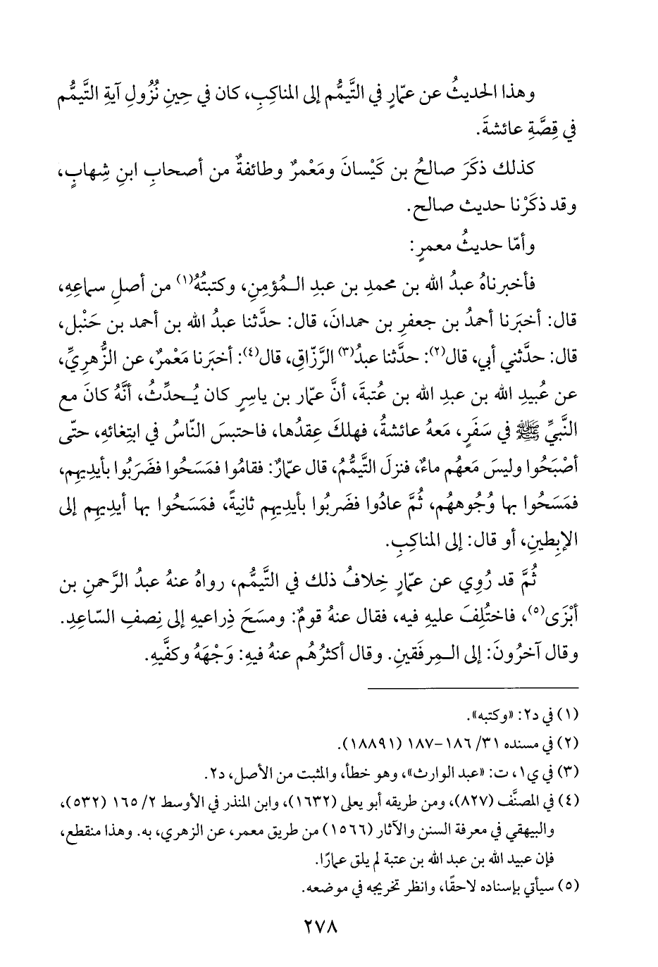 فأخبرناهُ عبدُ الله بن محمدِ بن عبدِ المُؤمِنِ، وكتبتُهُ (¬١) من أصلِ سماعِهِ، قال: أخبَرنا أحمدُ بن جعفرِ بن حمدانَ، قال: حدَّثنا عبدُ الله بن أحمد بن حَنْبل، قال: حدَّثني أبي، قال (¬٢): حدَّثنا عبدُ (¬٣) الرَّزّاقِ، قال (¬٤): أخبَرنا مَعْمر، عن الزُّهرِيِّ، عن عُبيدِ الله بن عبدِ الله بن عُتبةَ، أنَّ عمّار بن ياسِرٍ كان يُحدِّثُ، أنَّهُ كانَ مع النَّبيِّ - صلى الله عليه وسلم - في سَفَرٍ، مَعهُ عائشةُ، فهلكَ عِقدُها، فاحتبسَ النّاسُ في ابتِغائهِ، حتَّى أصْبَحُوا وليسَ مَعهُم ماءٌ، فنزلَ التَّيمُّمُ، قال عمّار: فقامُوا فمَسَحُوا فضَرَبُوا بأيدِيهِم، فمَسَحُوا بها وُجُوههُم، ثُمَّ عادُوا فضَربُوا بأيدِيهِم ثانِيةً، فمَسَحُوا بها أيدِيهِم إلى الإبِطينِ، أو قال: إلى المناكِبِ.